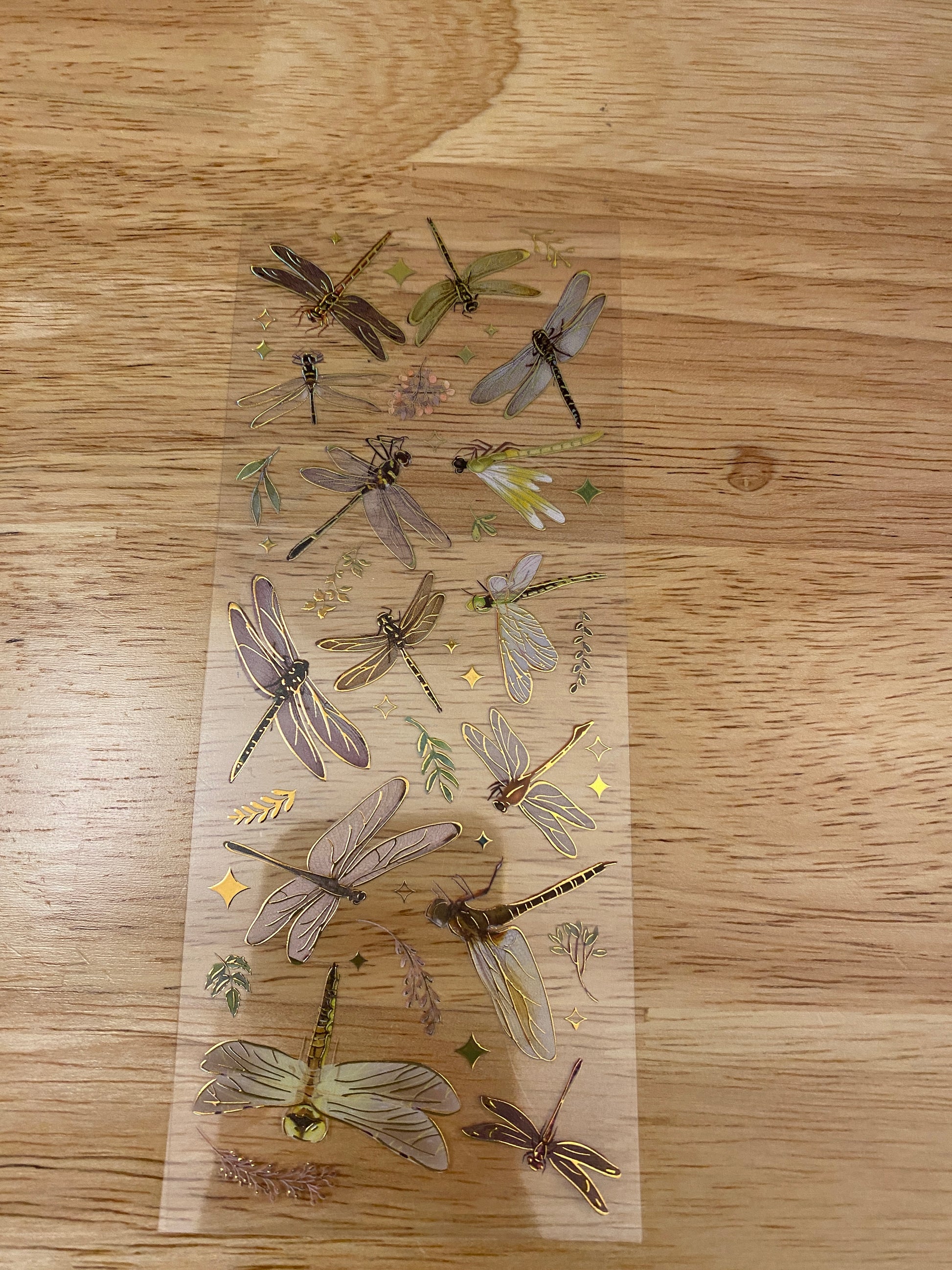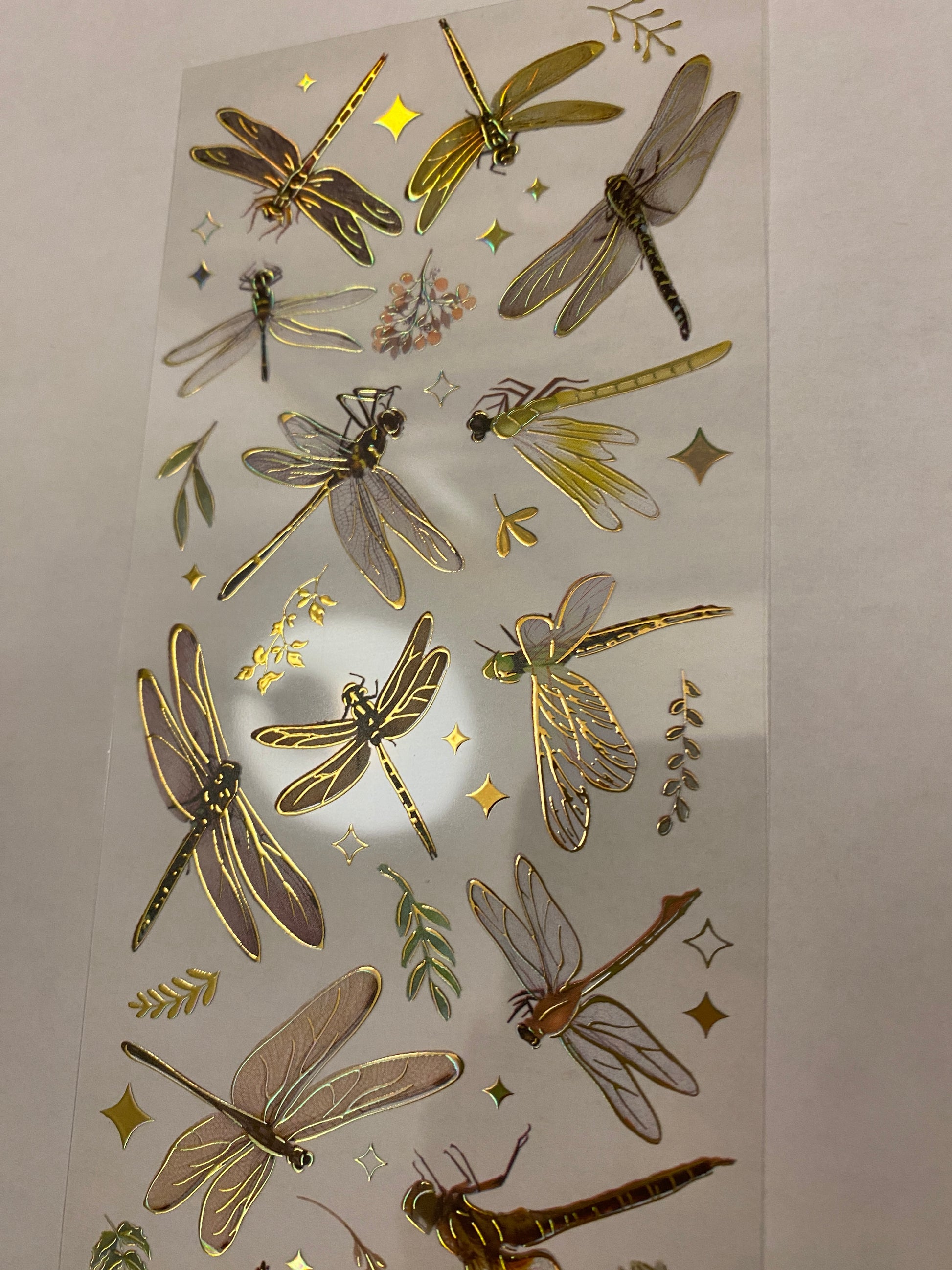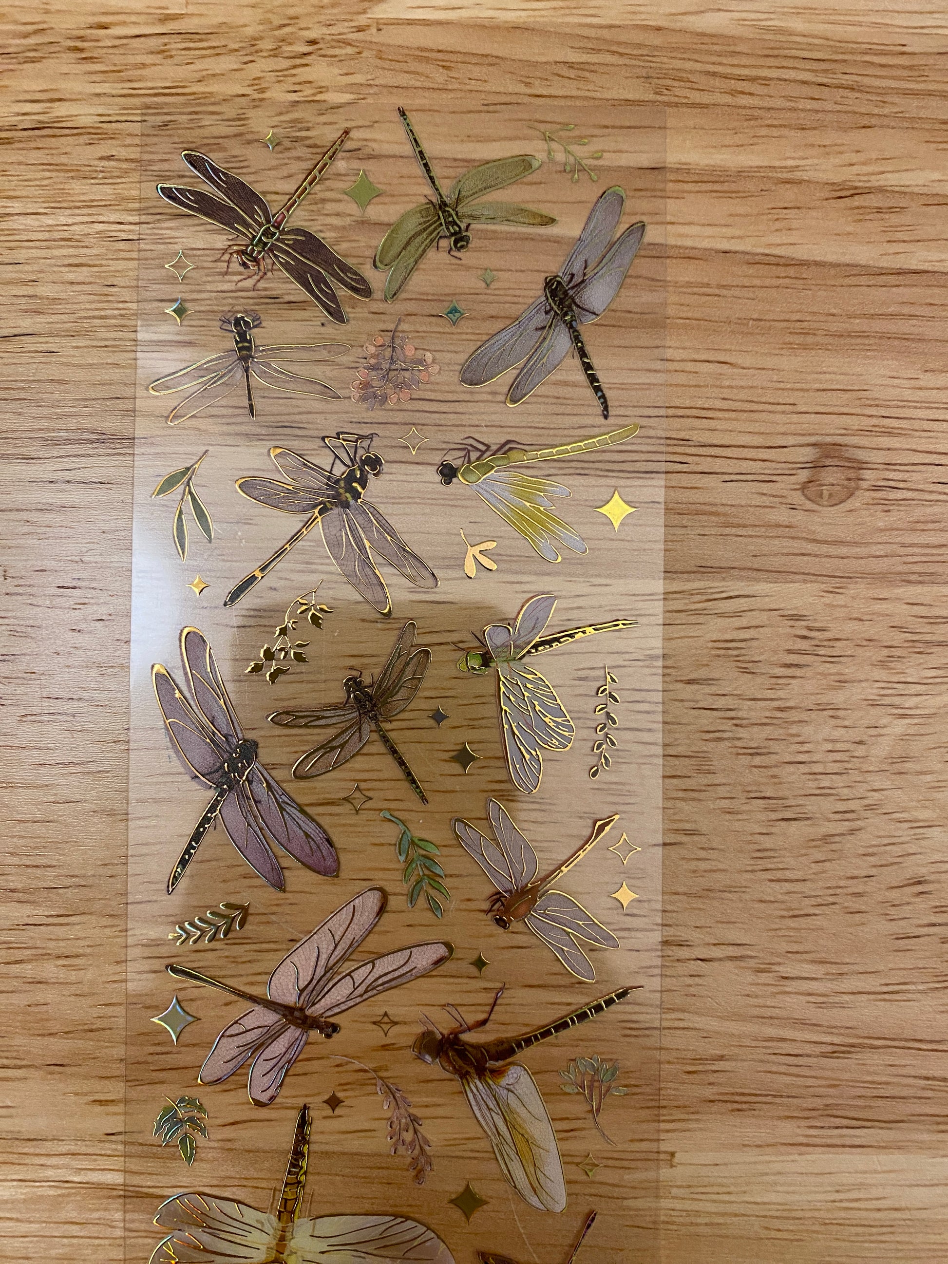 PET Clear Tape with Green Dragon Flies some outlined with Gold Foil. Decorative Sticker Tape For Scrap booking planner, this is not individual stickers, these are all on the washi tape, it has a very pretty Gold Foil raised up look. Tape is easy to cut with and you can cut out each Feather.