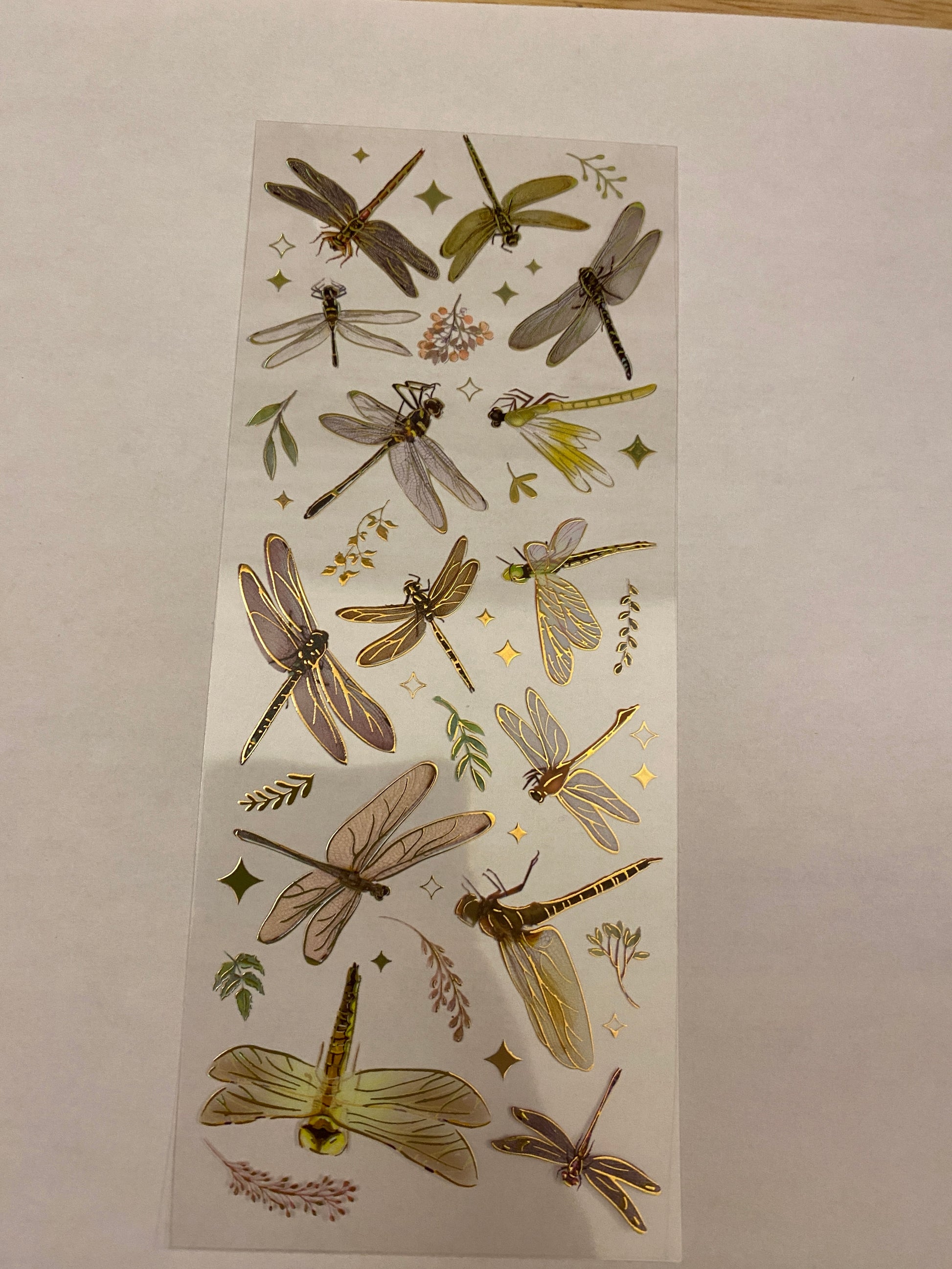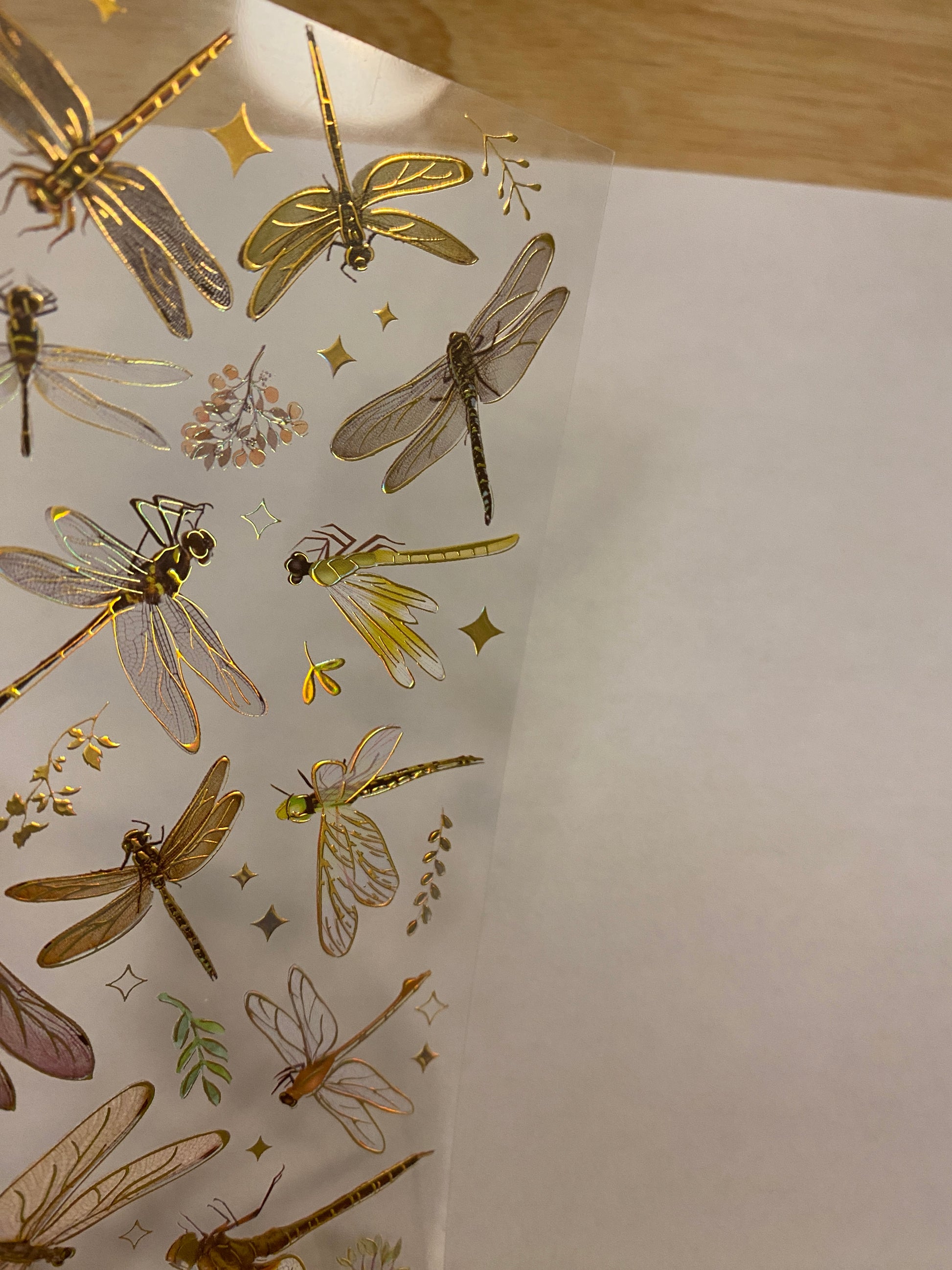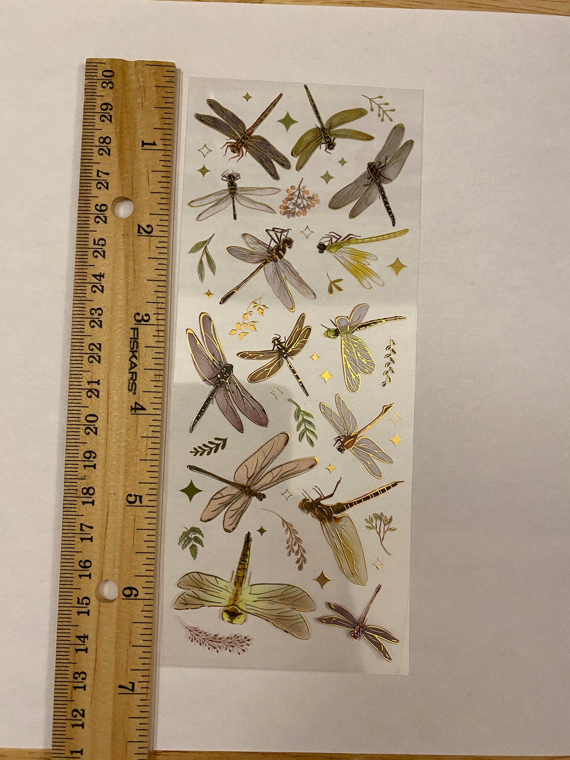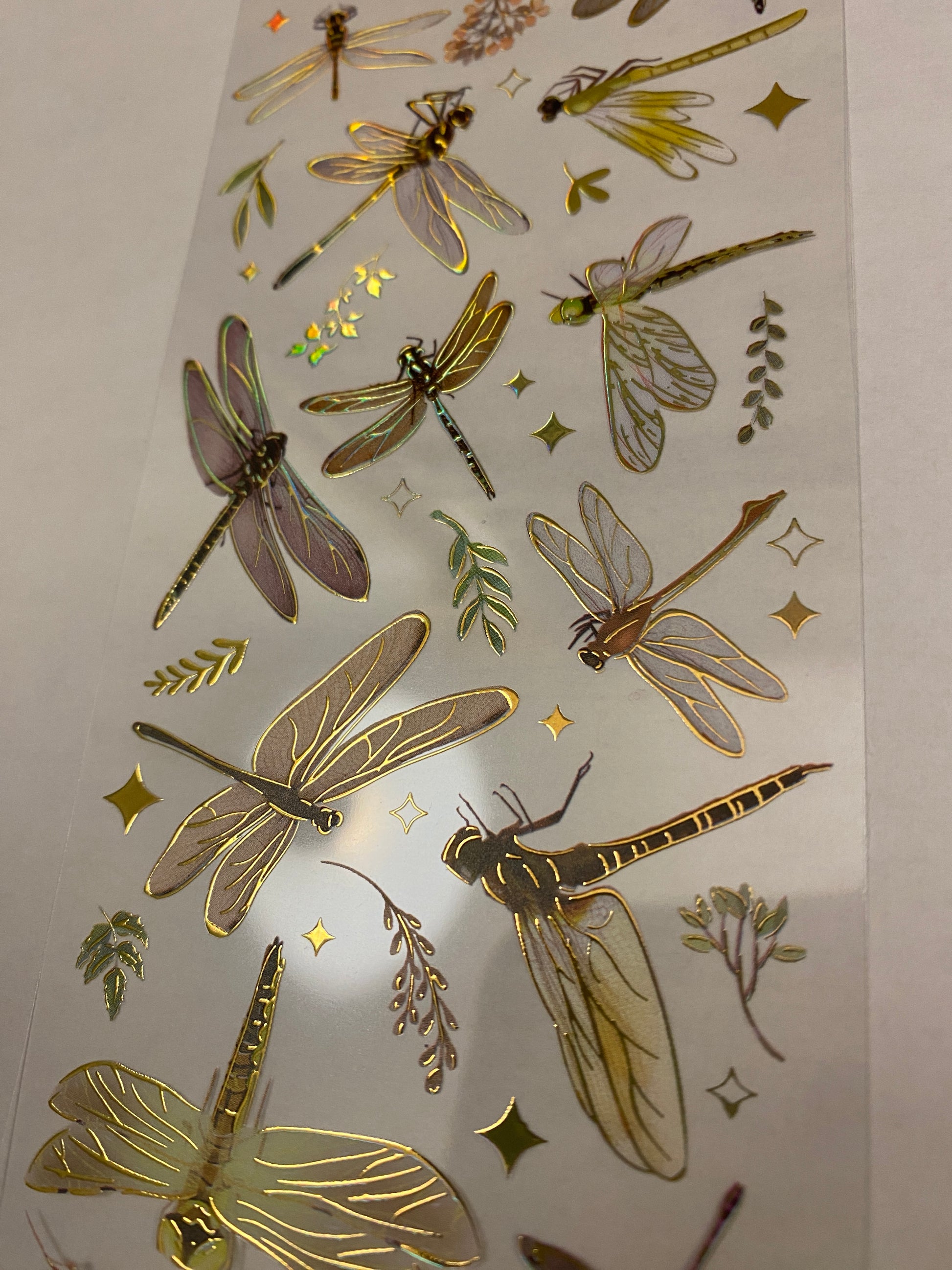 PET Clear Tape with Green Dragon Flies some outlined with Gold Foil. Decorative Sticker Tape For Scrap booking planner, this is not individual stickers, these are all on the washi tape, it has a very pretty Gold Foil raised up look. Tape is easy to cut with and you can cut out each Feather.