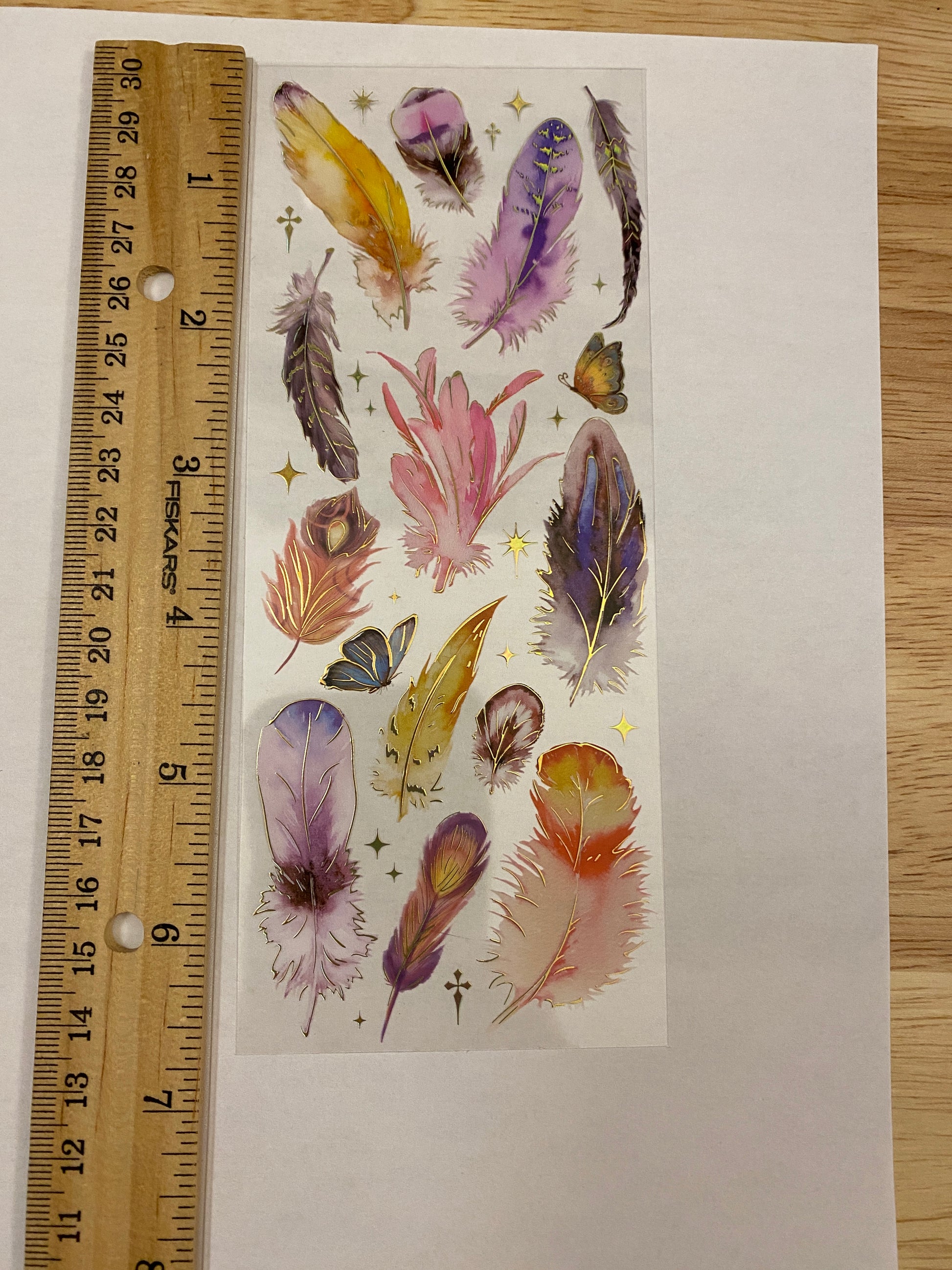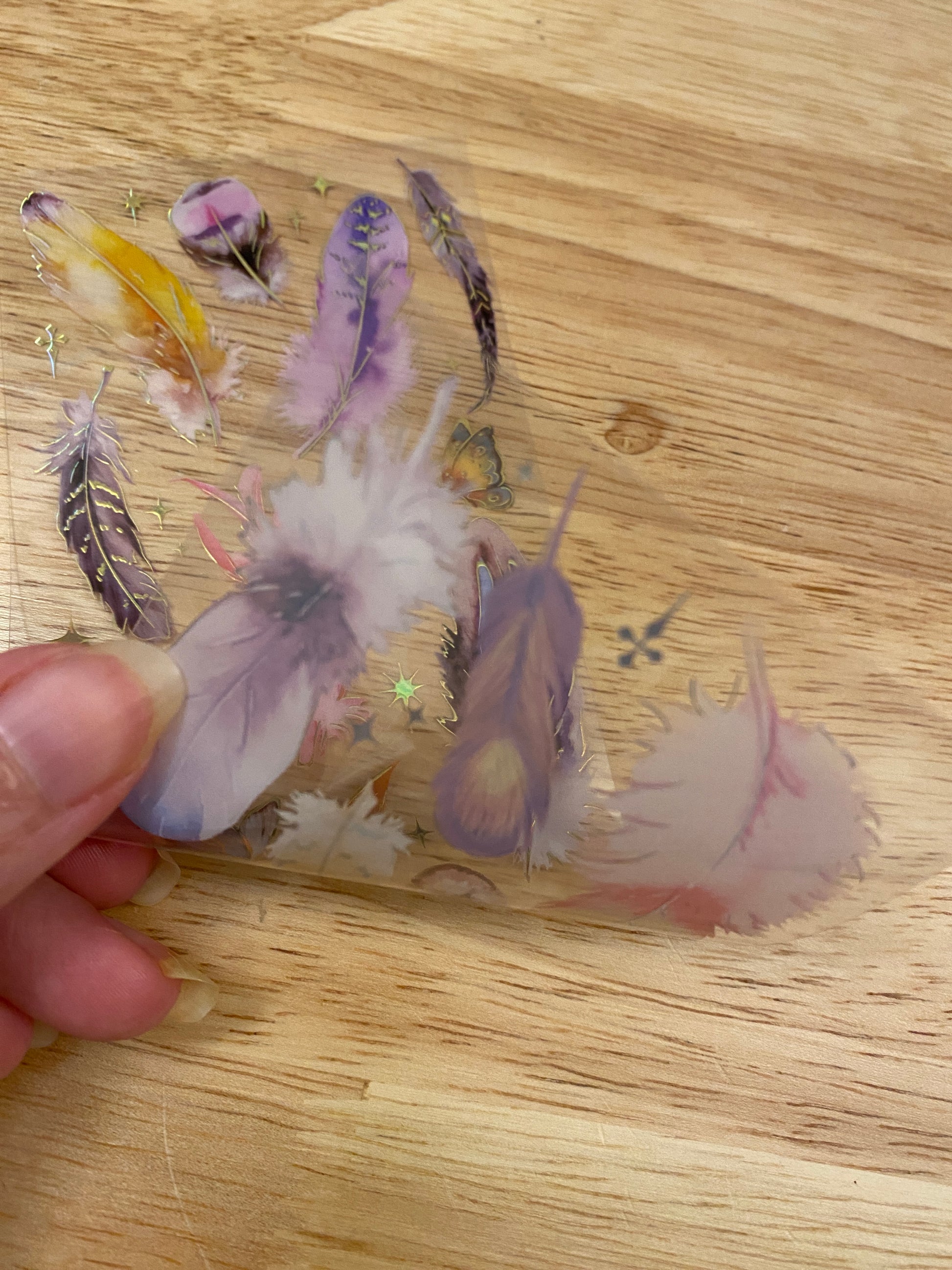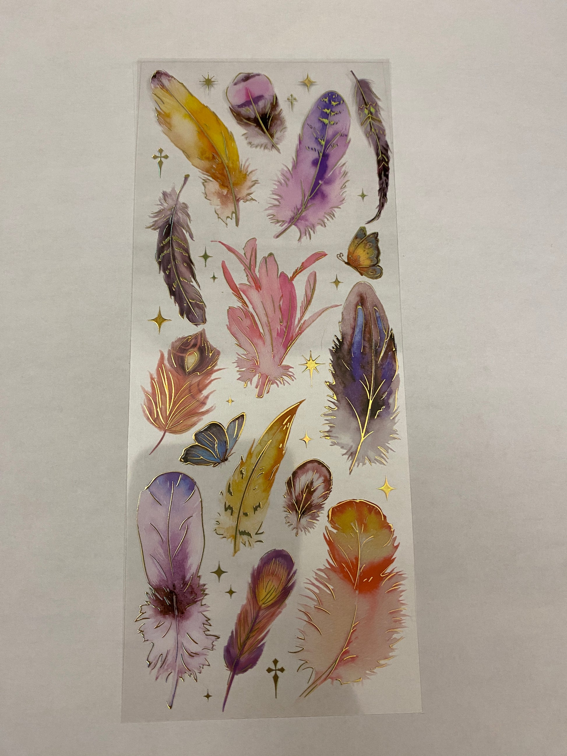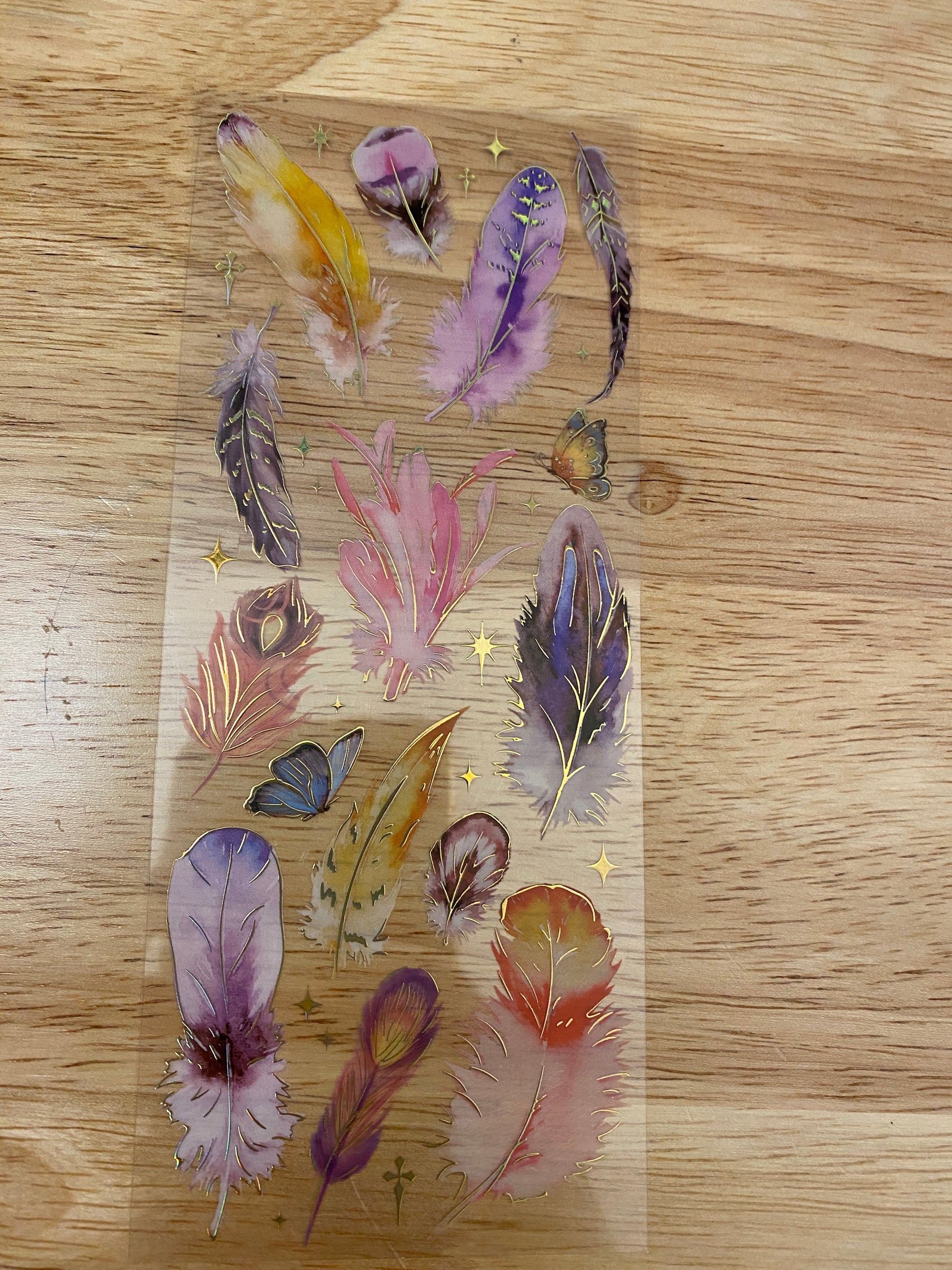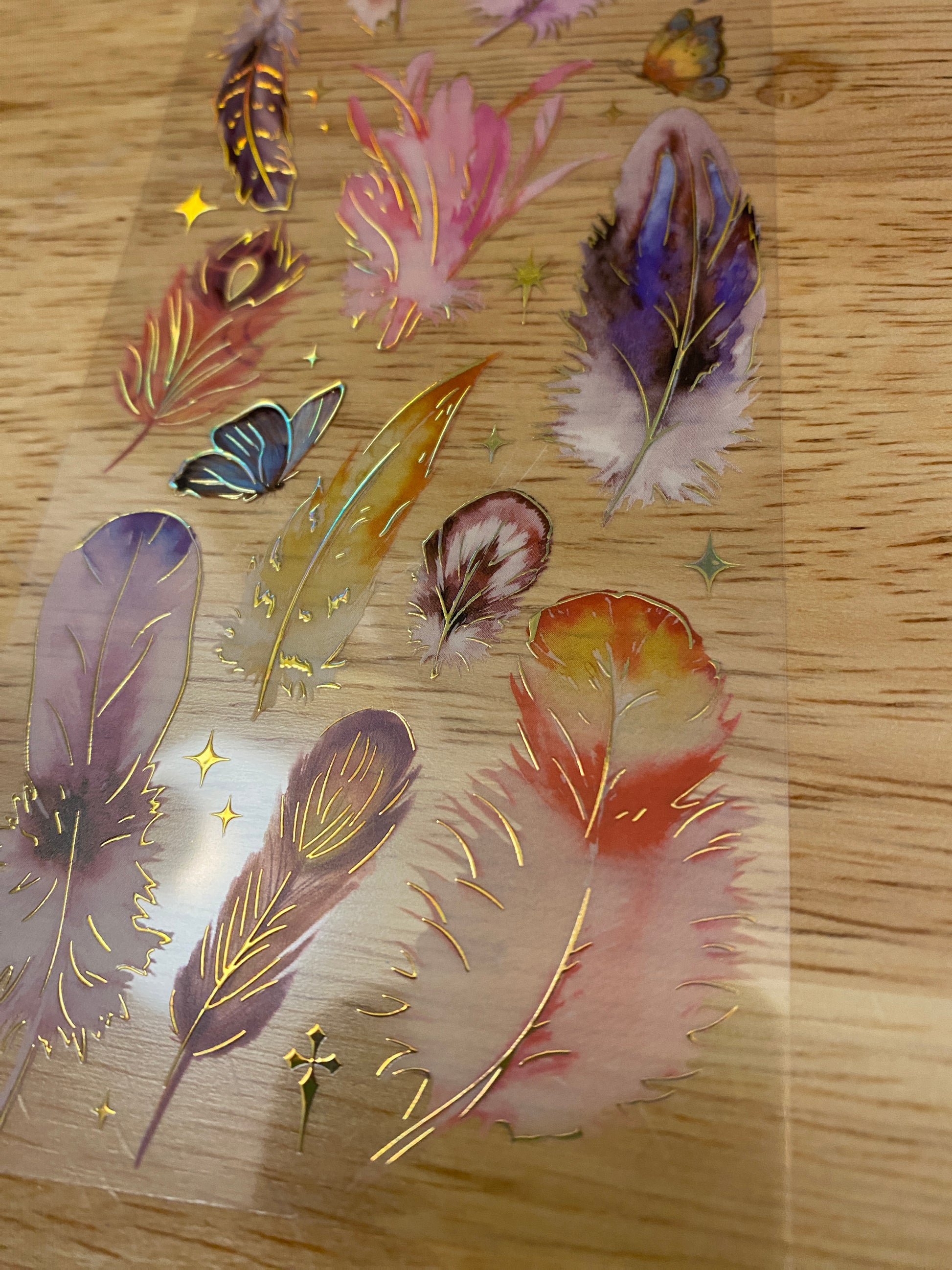 PET Clear Tape with Orange Feathers some outlined with Gold Foil. Decorative Sticker Tape For Scrap booking planner, this is not individual stickers, these are all on the washi tape, it has a very pretty Gold Foil raised up look. Tape is easy to cut with and you can cut out each Feather.