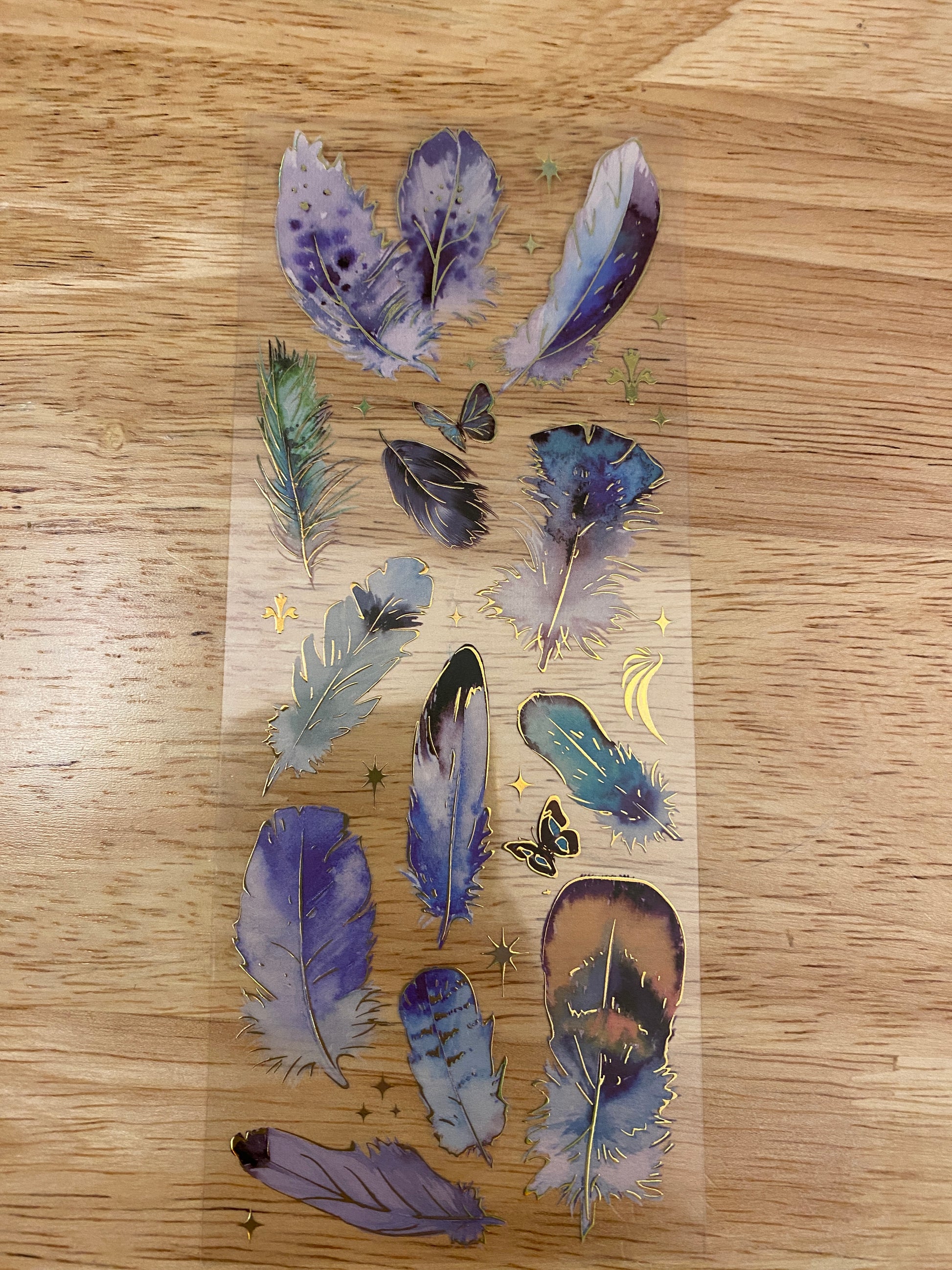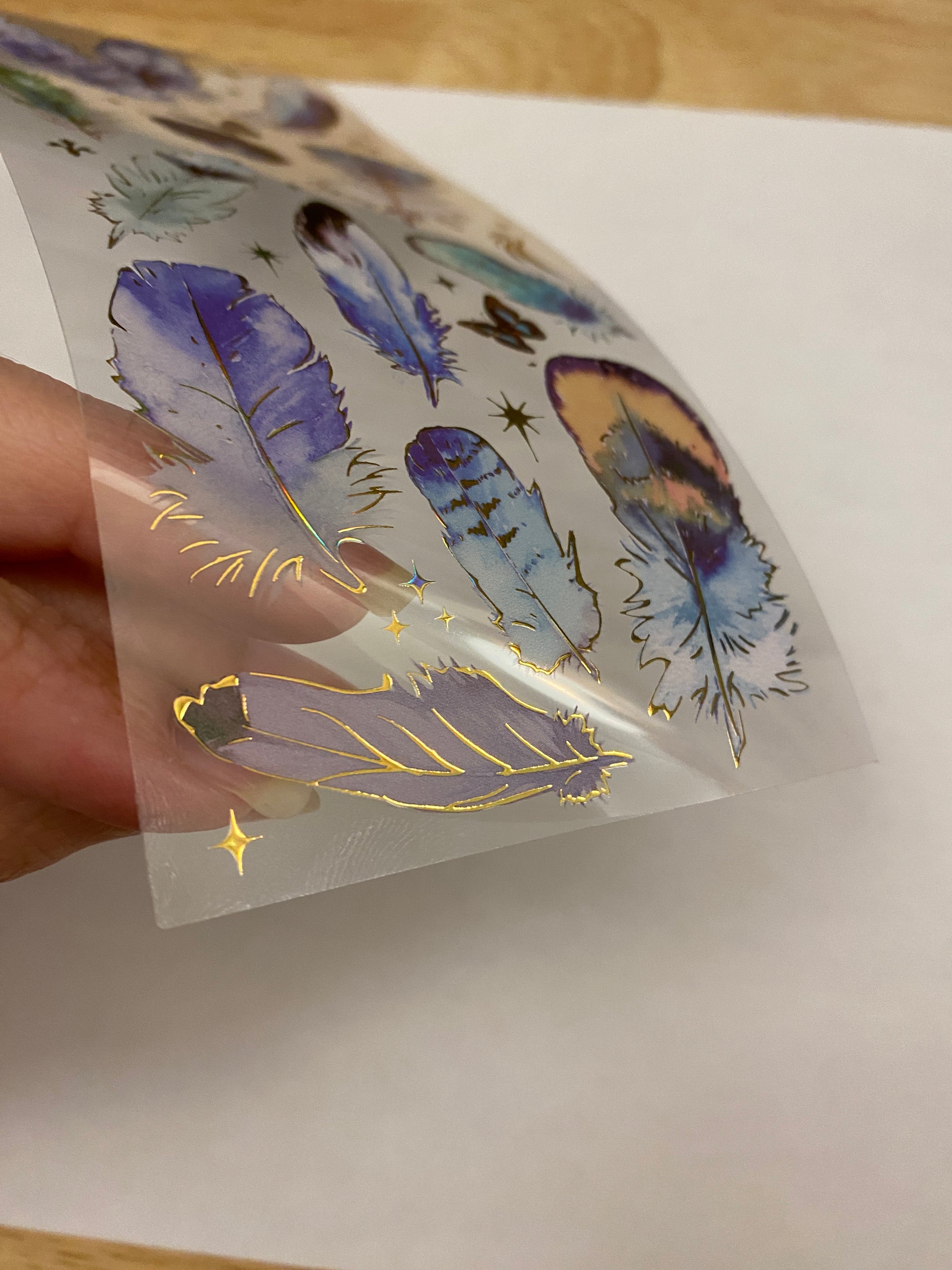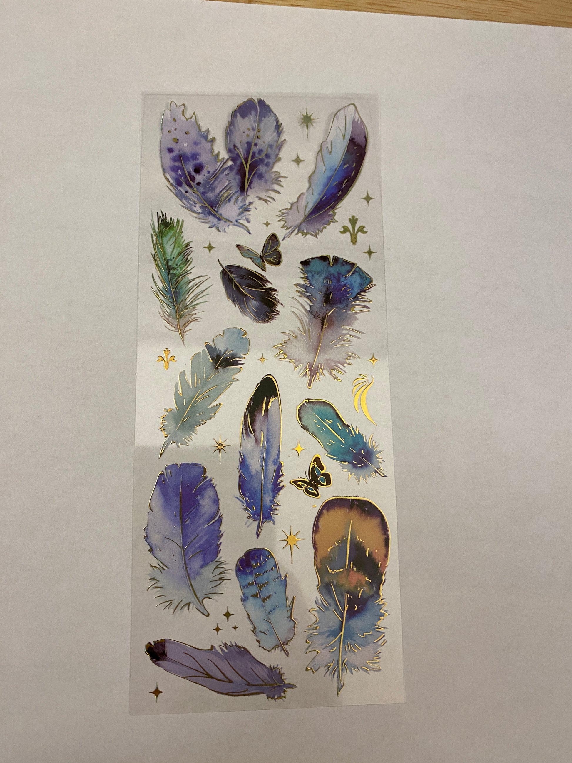 PET Clear Tape with Purple Feathers some outlined with Gold Foil. Decorative Sticker Tape For Scrap booking planner, this is not individual stickers, these are all on the washi tape, it has a very pretty Gold Foil raised up look. Tape is easy to cut with and you can cut out each Feather.
