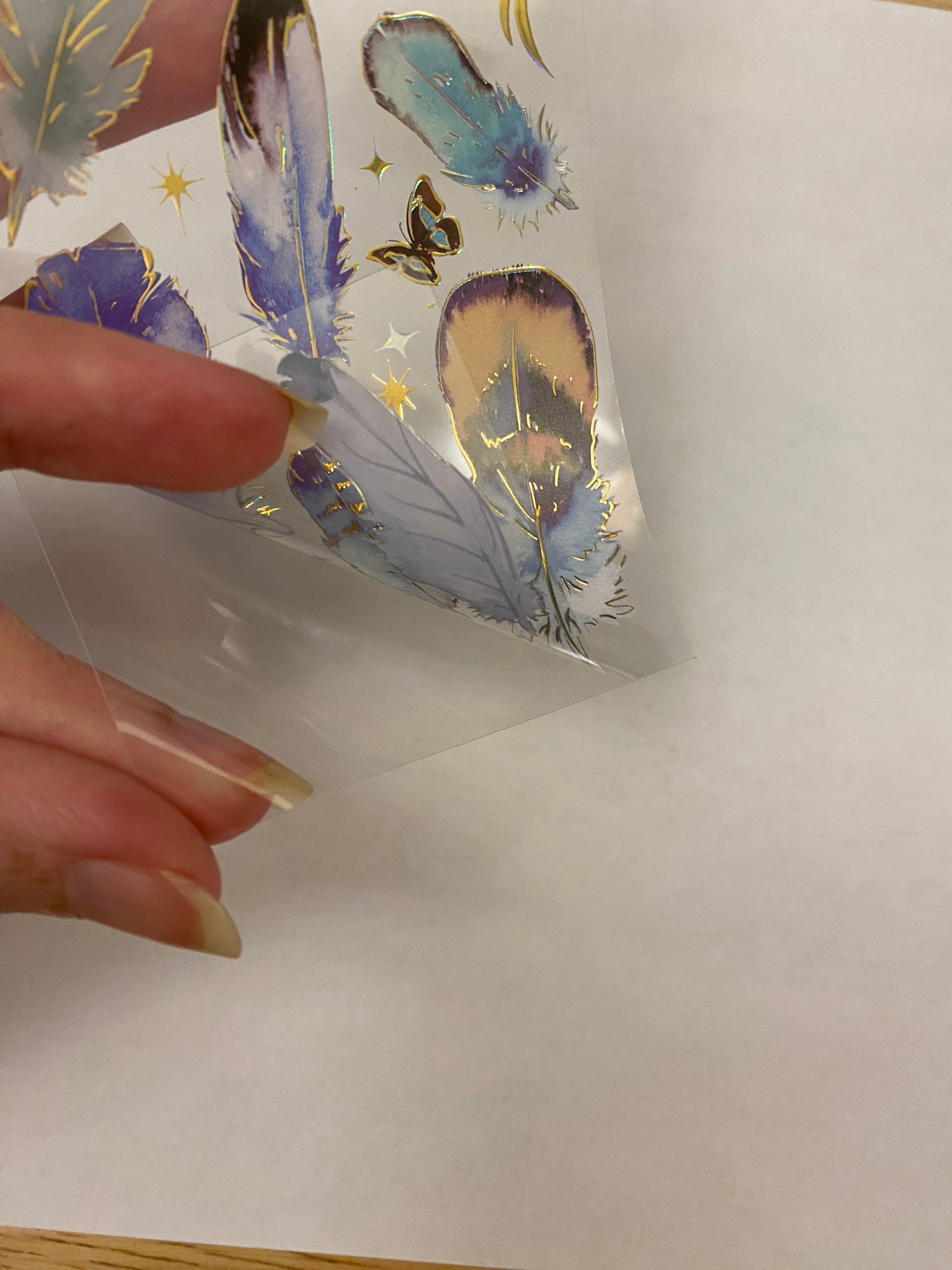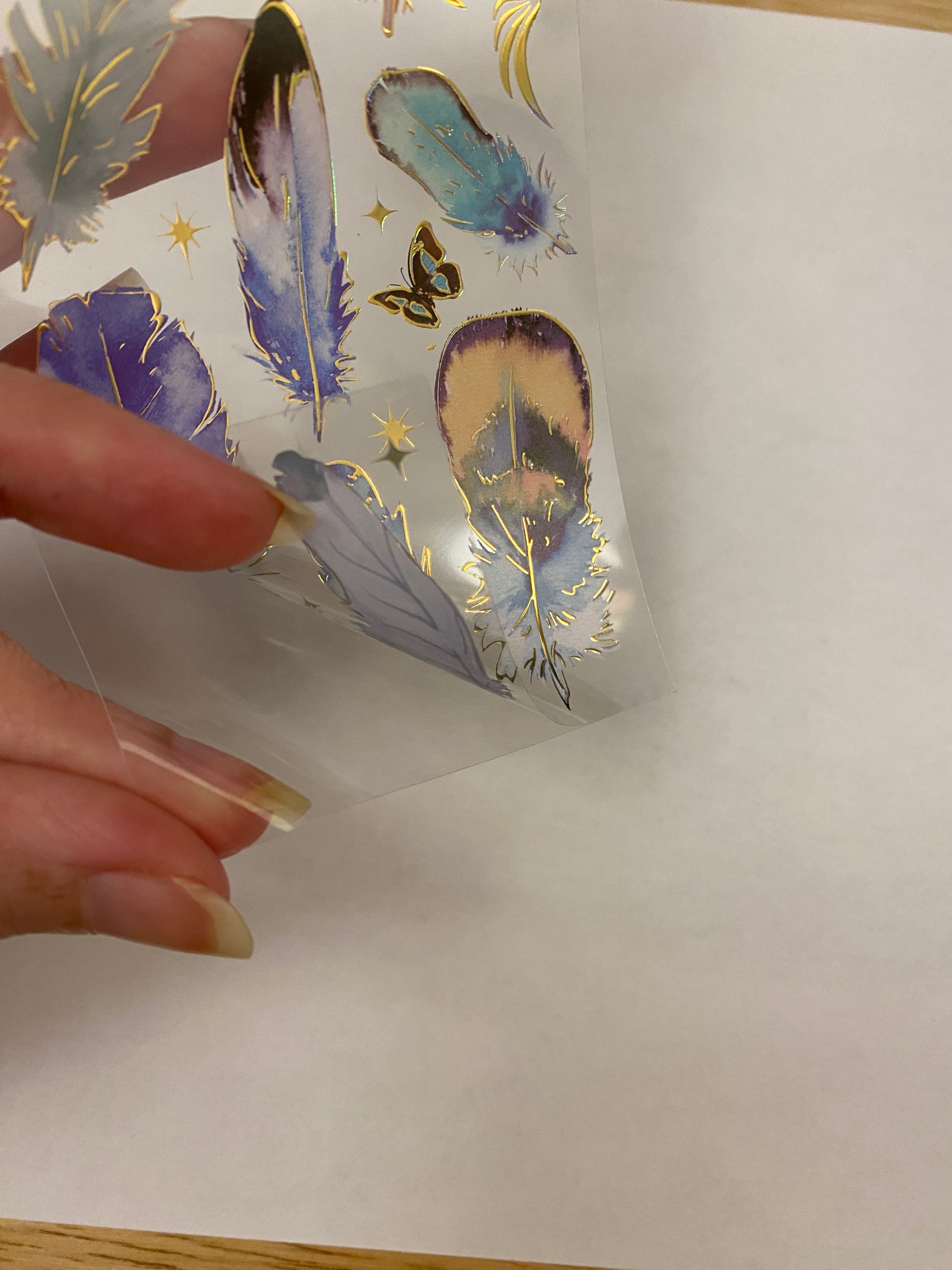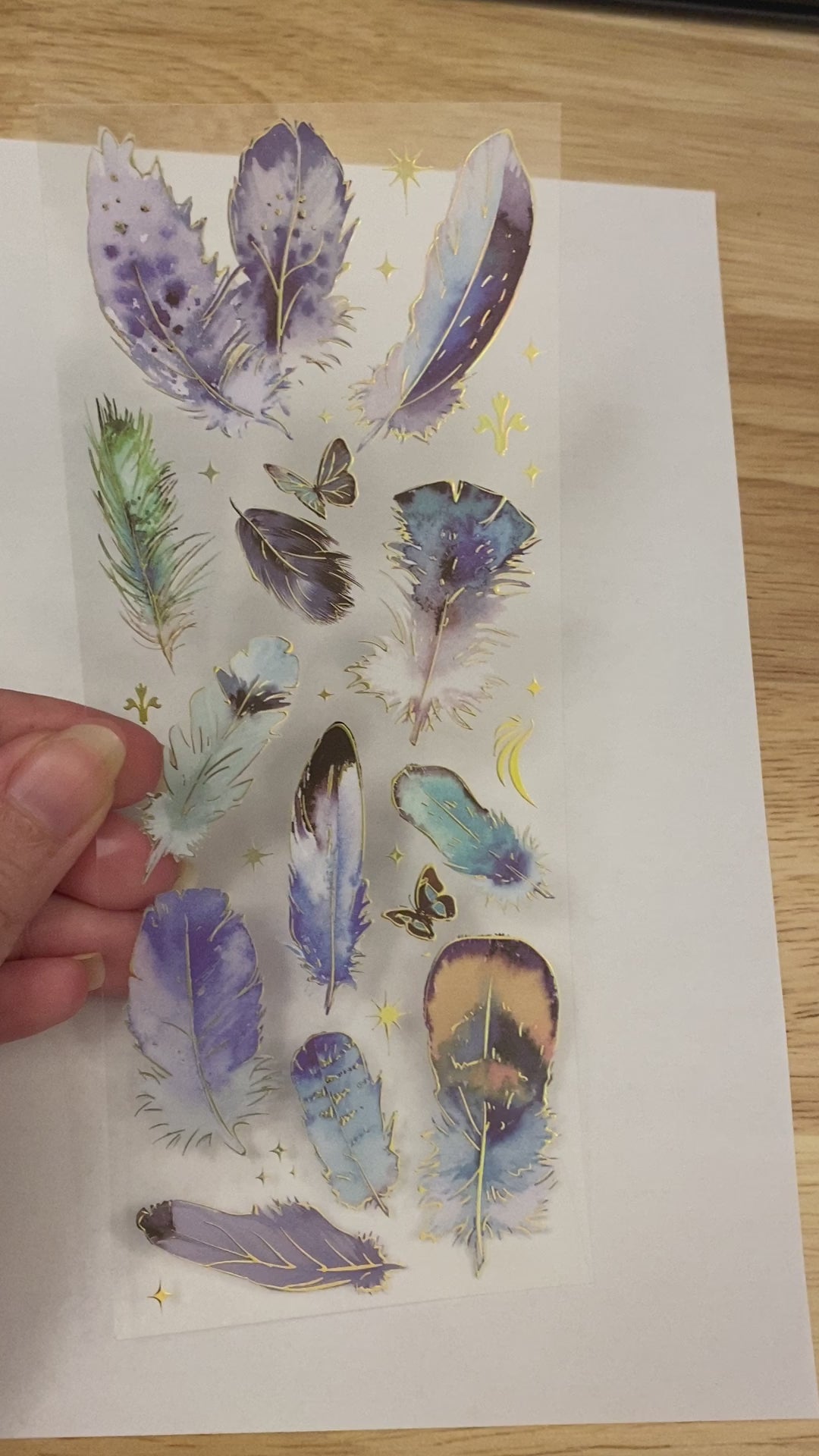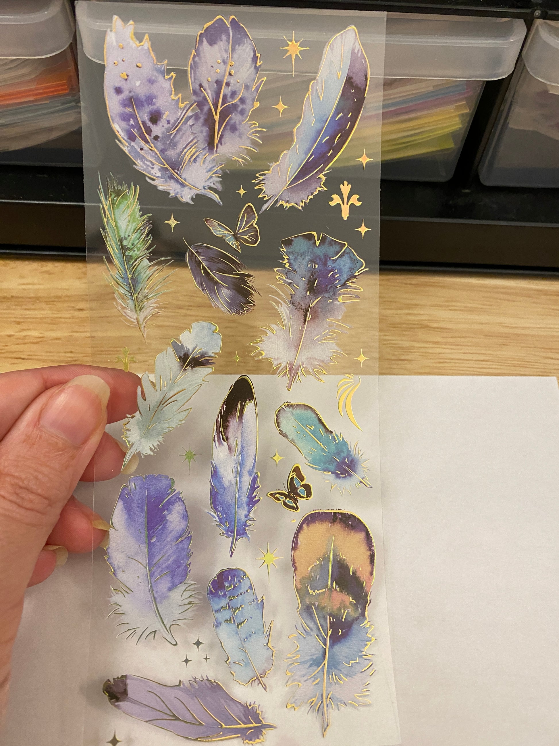 PET Clear Tape with Purple Feathers some outlined with Gold Foil. Decorative Sticker Tape For Scrap booking planner, this is not individual stickers, these are all on the washi tape, it has a very pretty Gold Foil raised up look. Tape is easy to cut with and you can cut out each Feather.