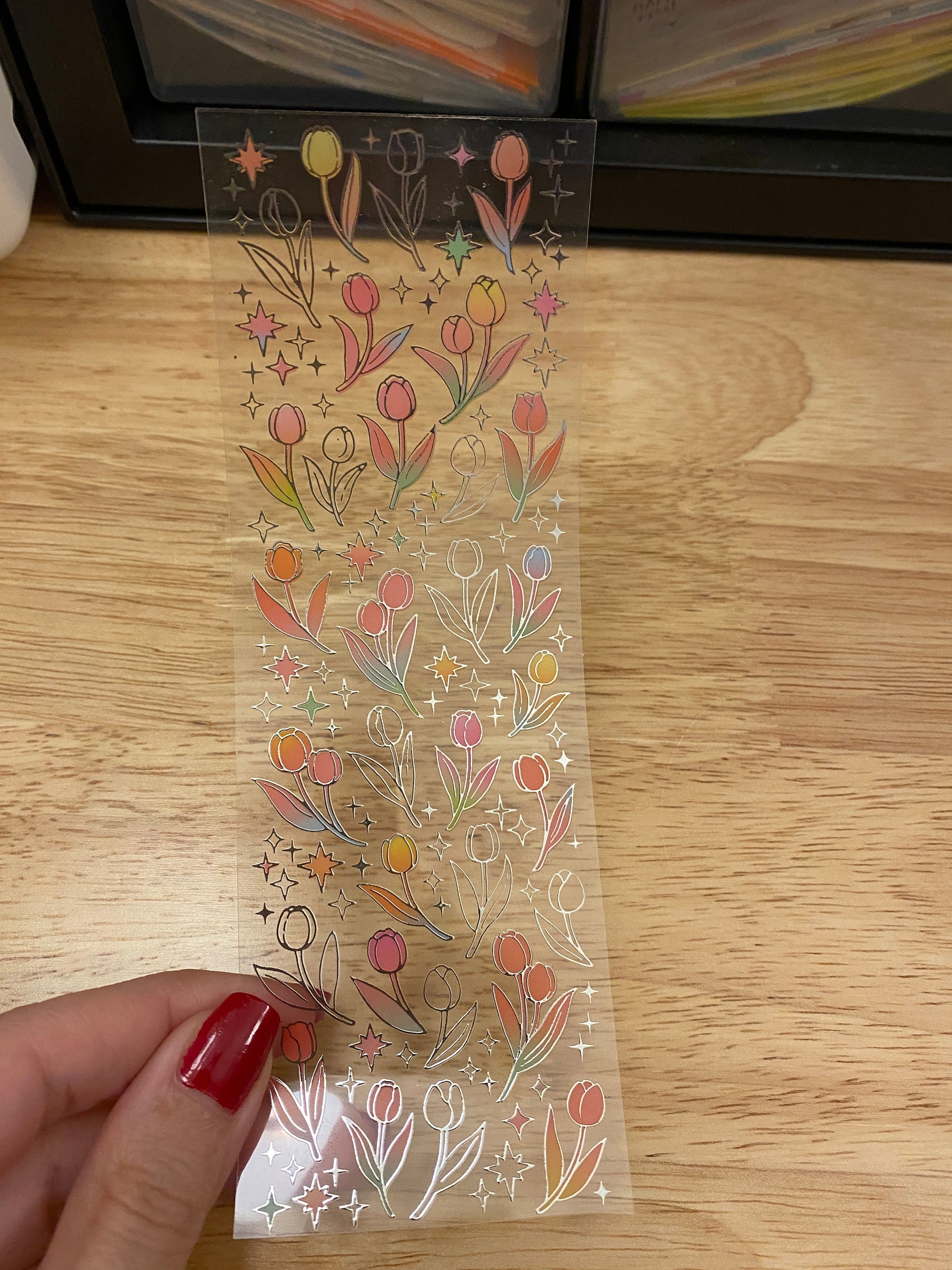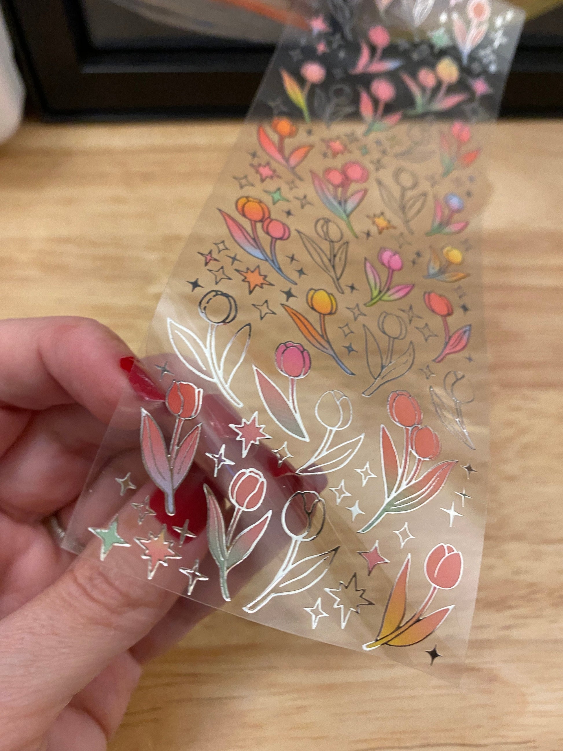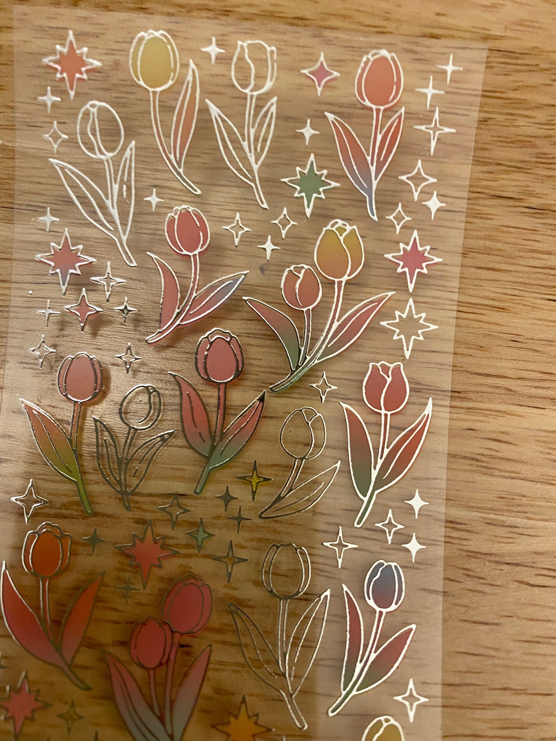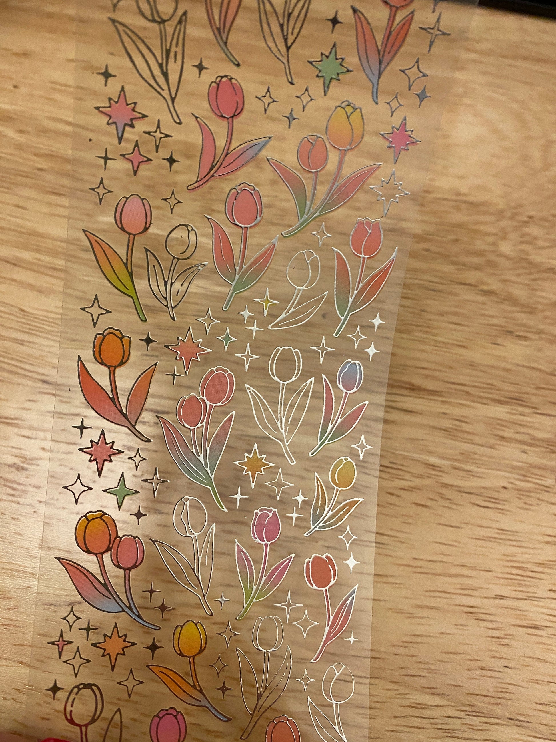 PET Clear Tape with Pretty Shiny Tulips Stars. Decorative Sticker Tape For Scrap booking Planner, this is not individual stickers, these are all on the washi tape, it has a very pretty holographic raised up look.