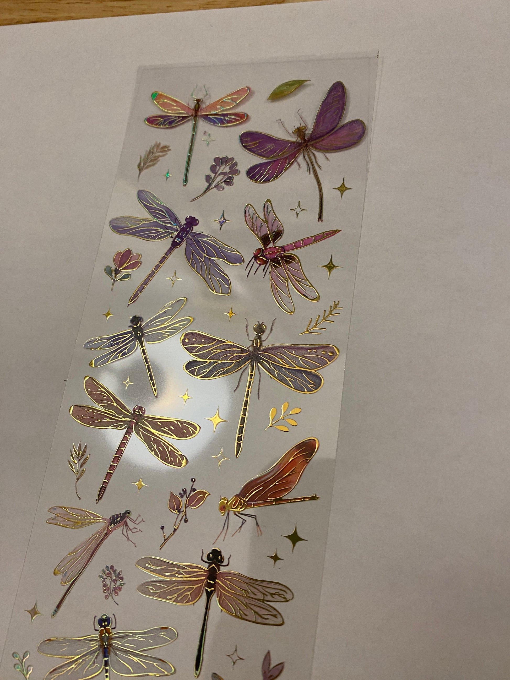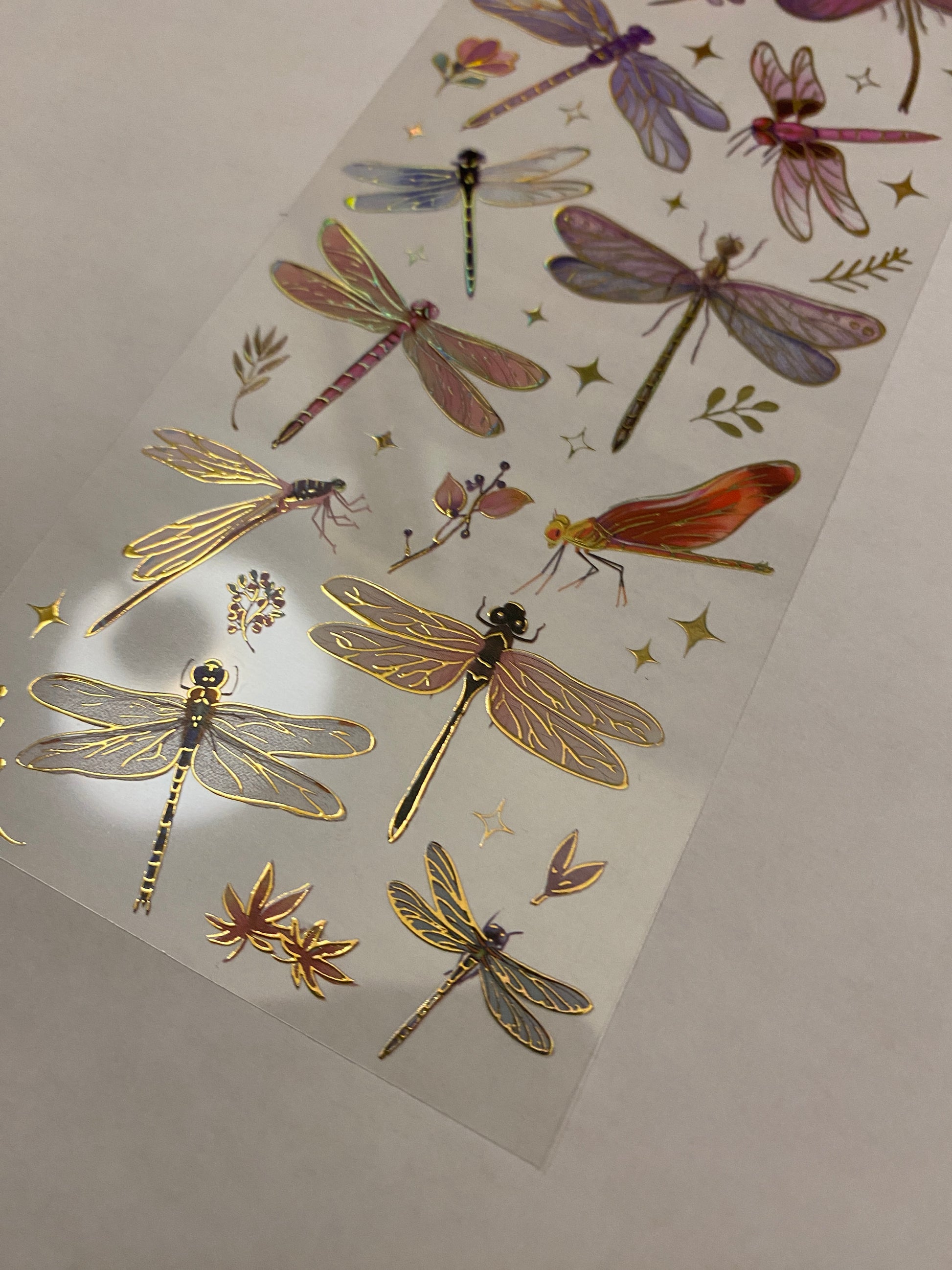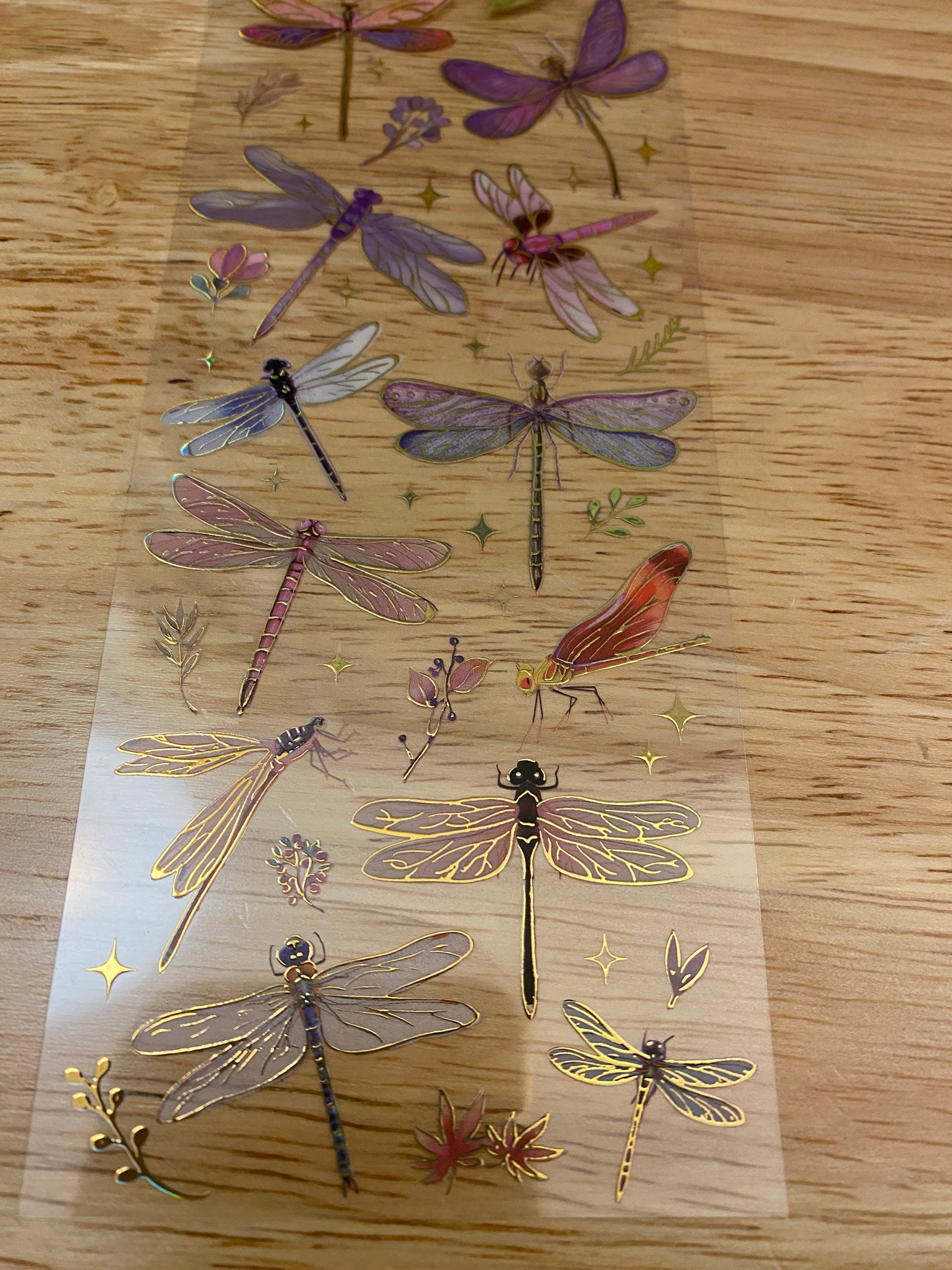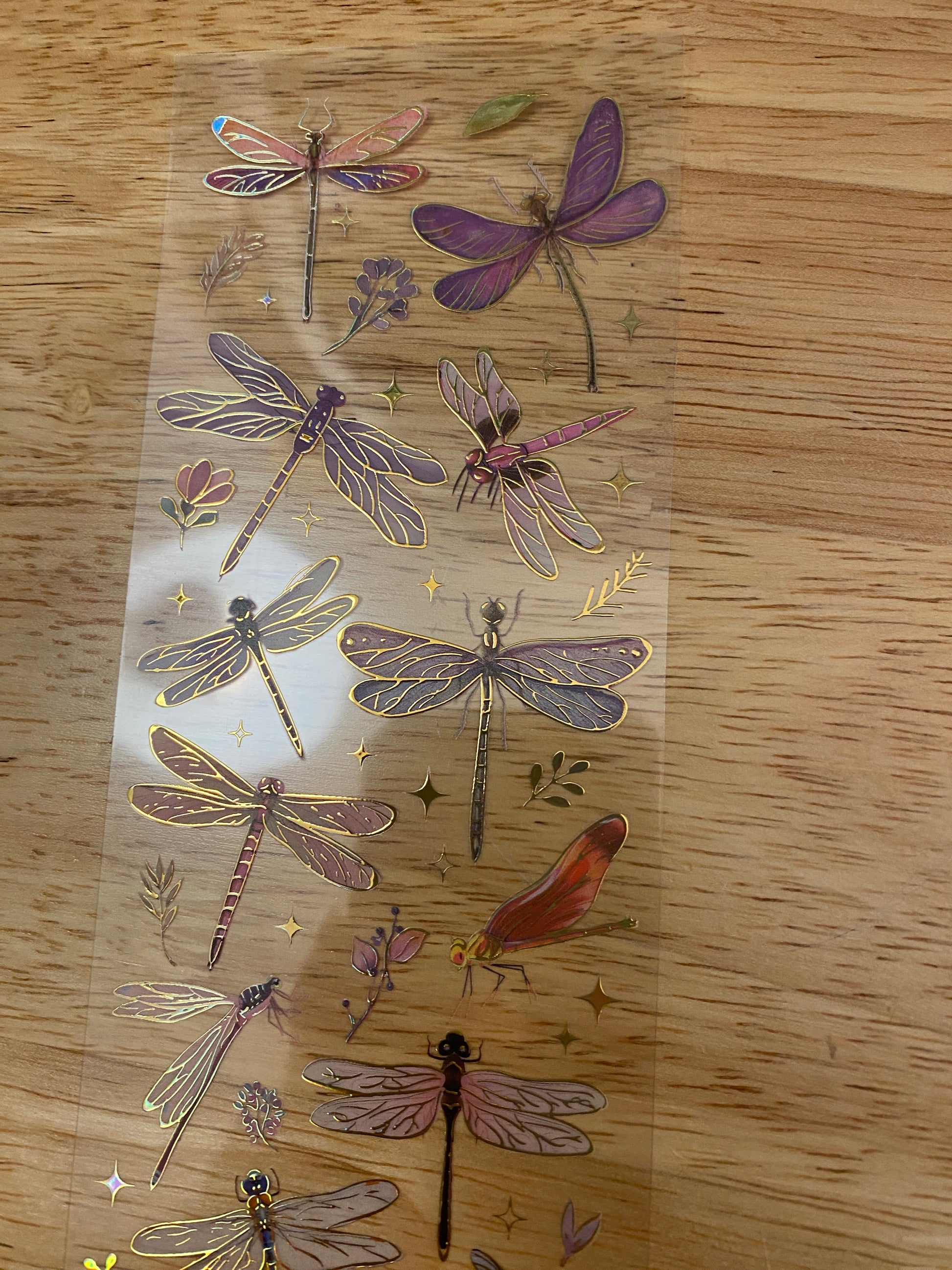 PET Clear Tape with Pink Dragon Flies some outlined with Gold Foil. Decorative Sticker Tape For Scrap booking planner, this is not individual stickers, these are all on the washi tape, it has a very pretty Gold Foil raised up look. Tape is easy to cut with and you can cut out each Feather.