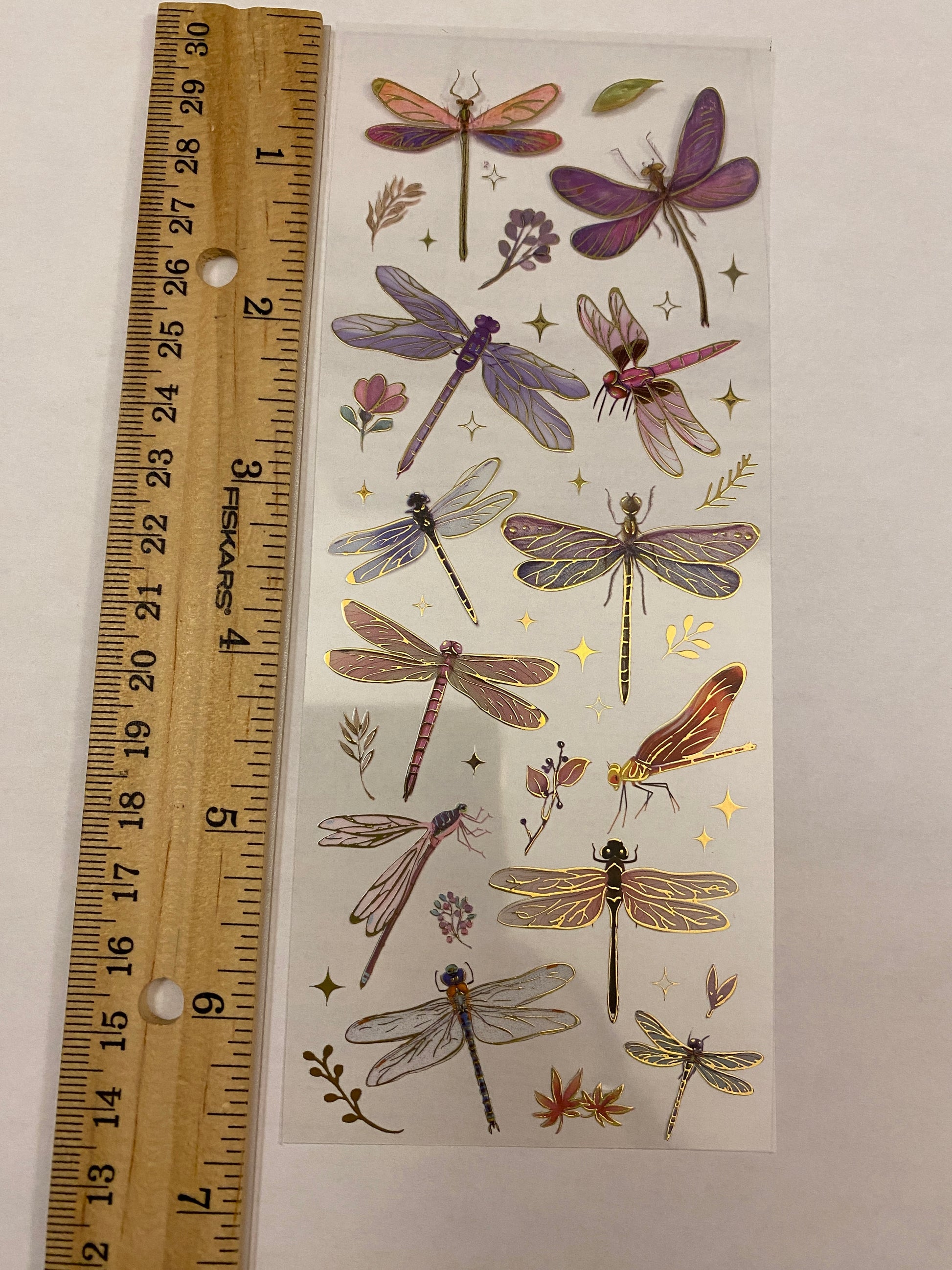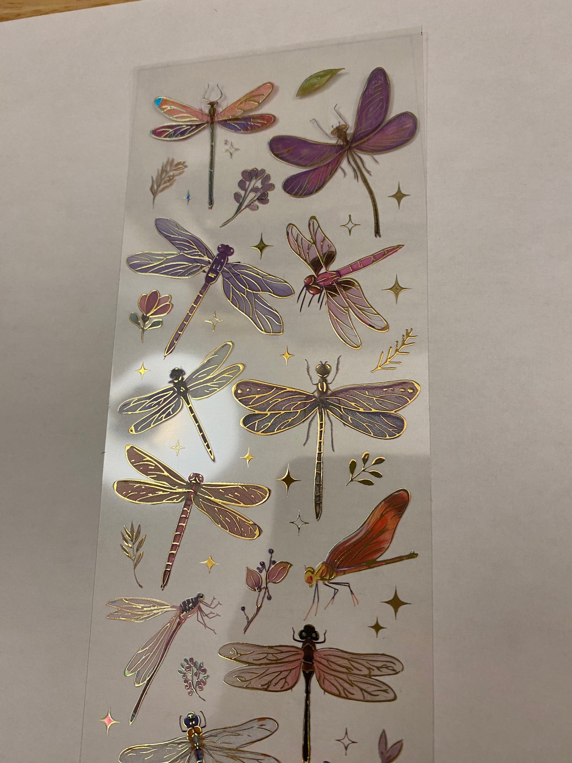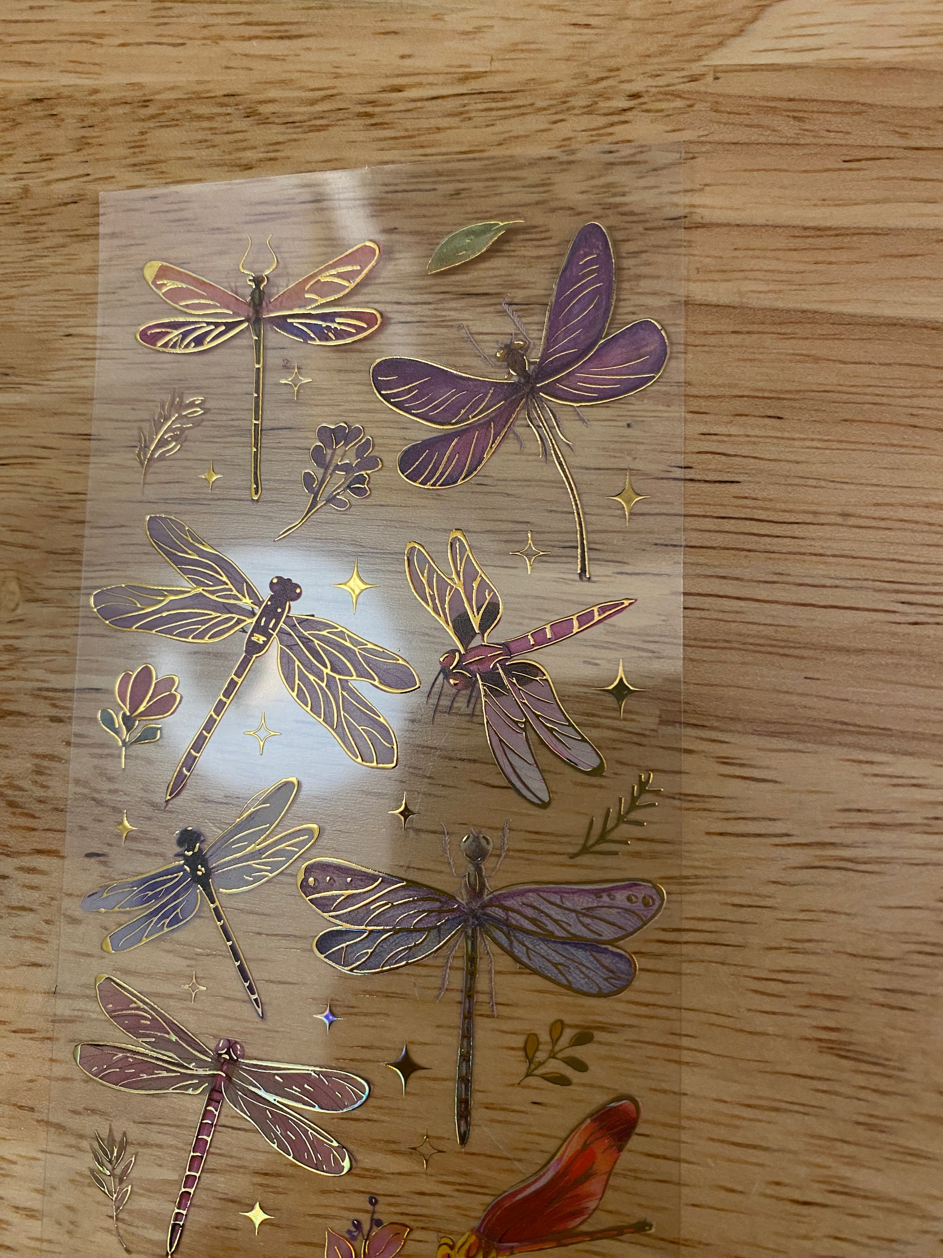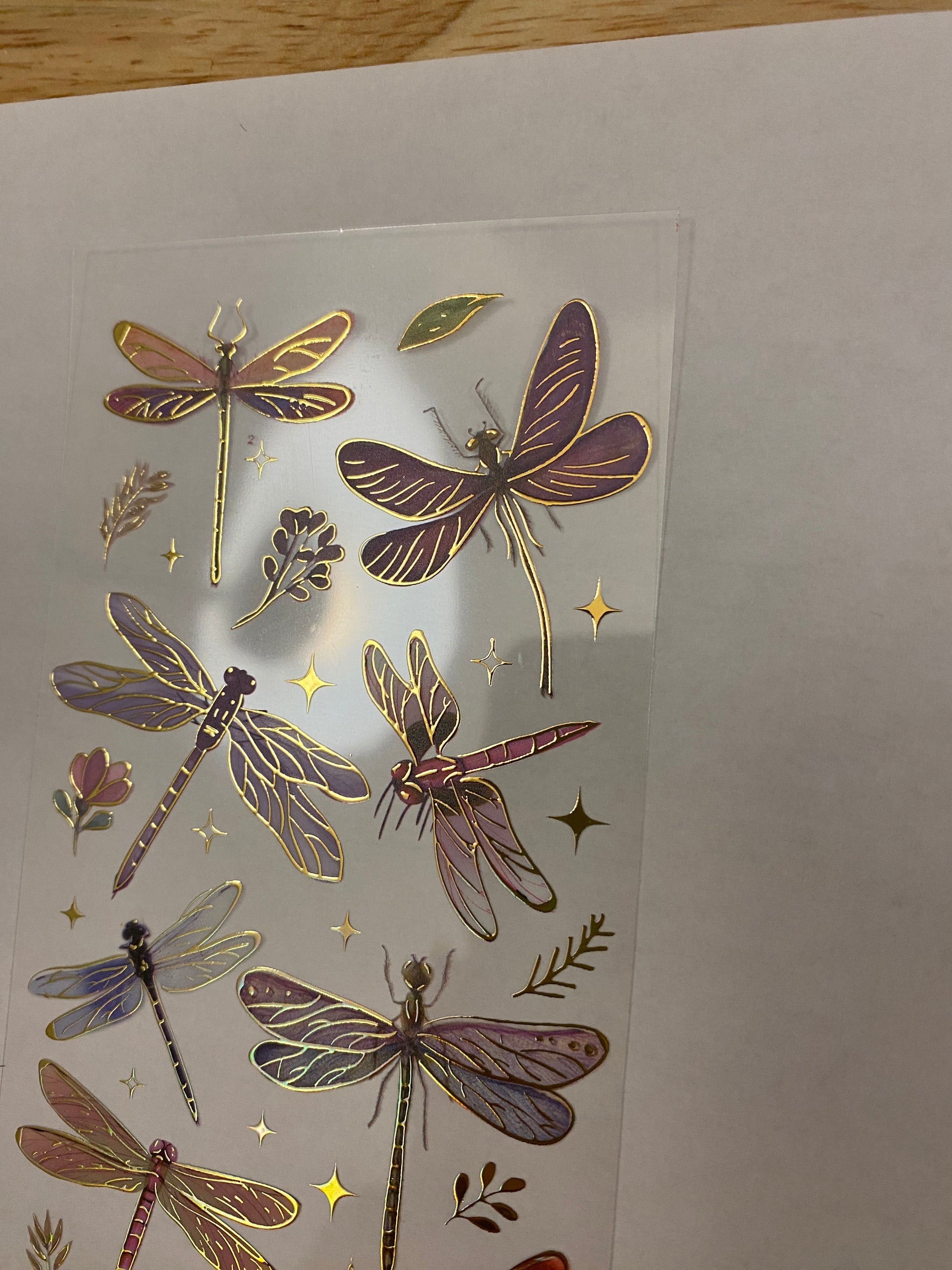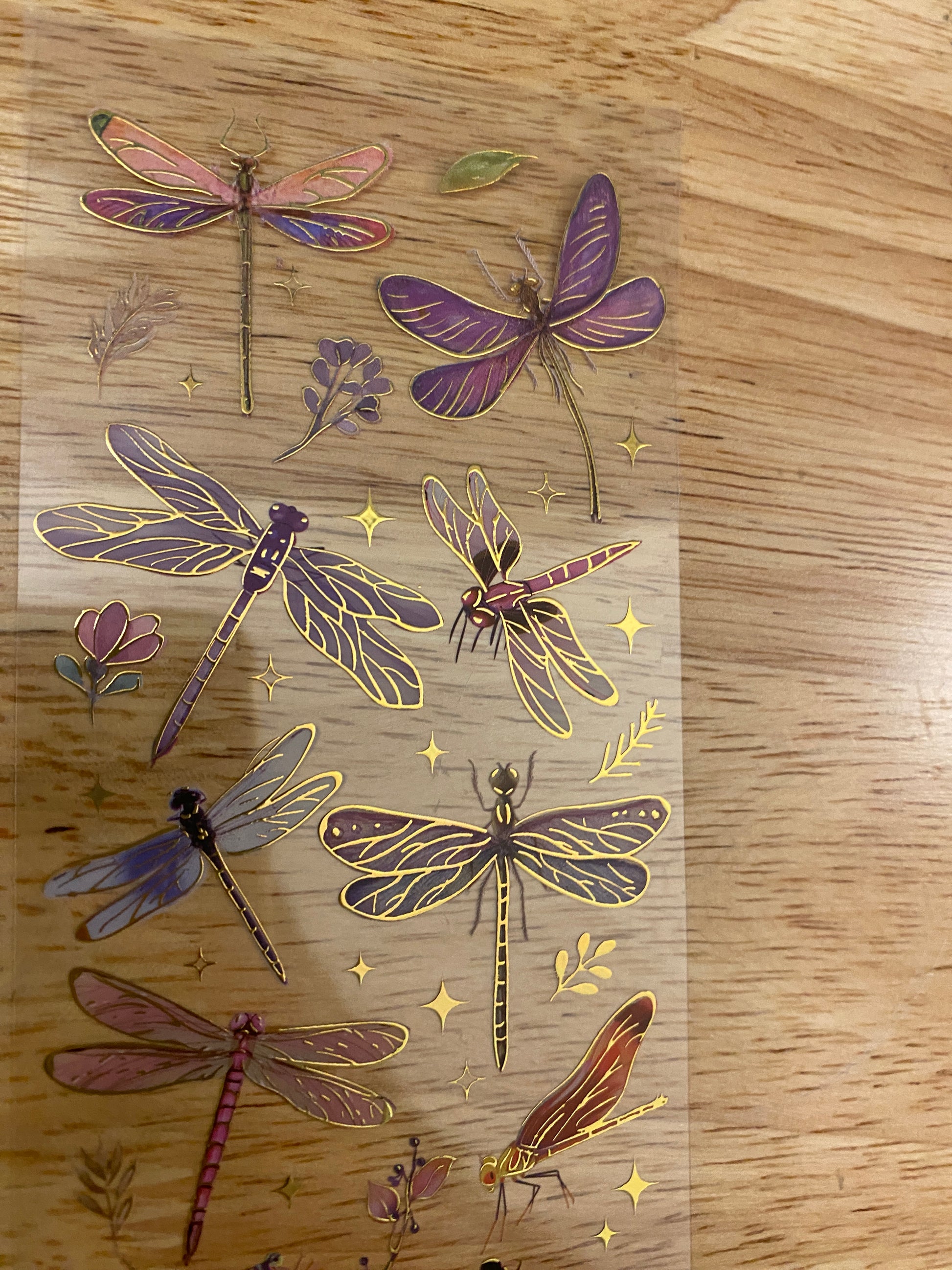 PET Clear Tape with Pink Dragon Flies some outlined with Gold Foil. Decorative Sticker Tape For Scrap booking planner, this is not individual stickers, these are all on the washi tape, it has a very pretty Gold Foil raised up look. Tape is easy to cut with and you can cut out each Feather.