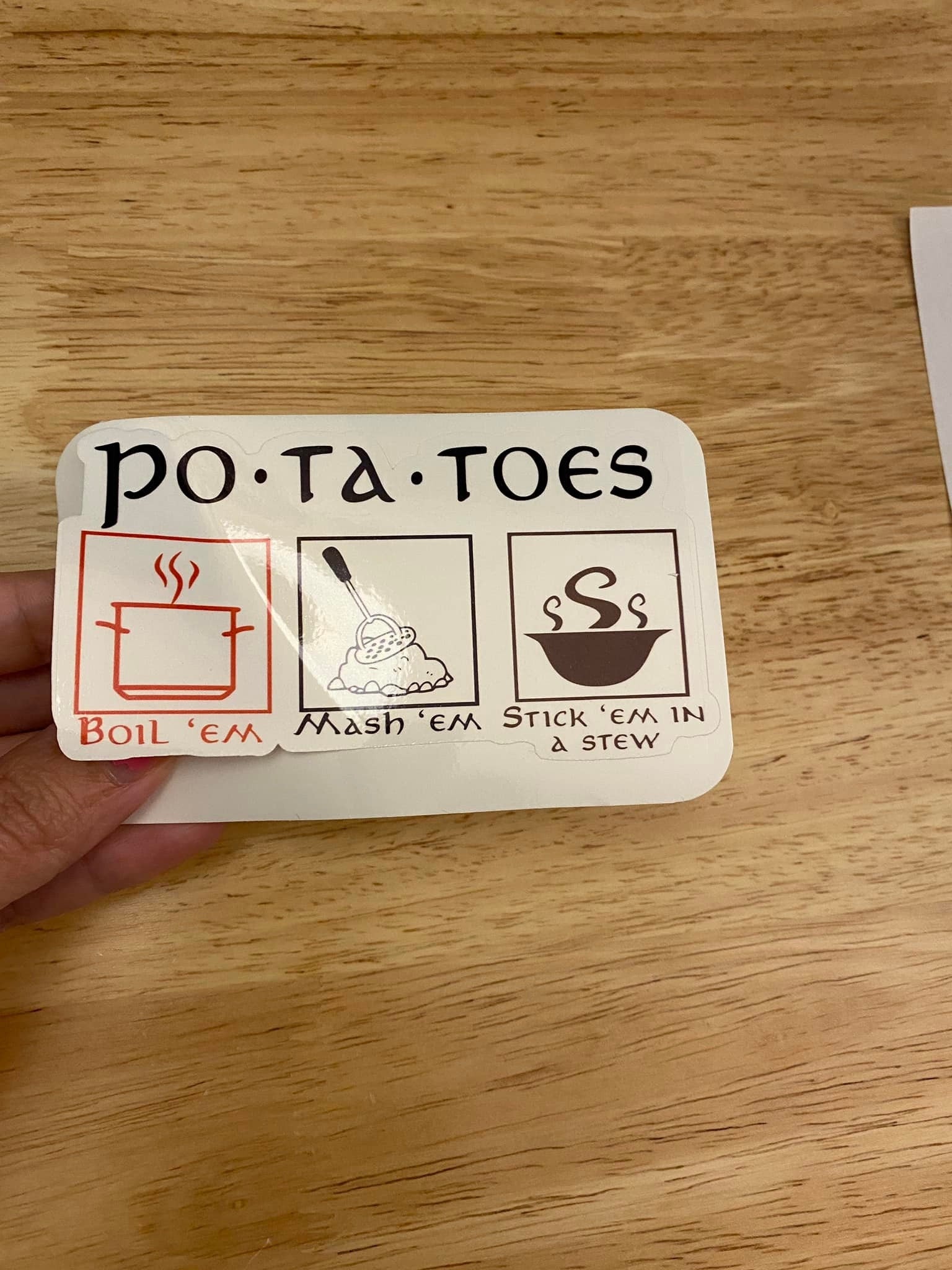 Potatoes Boil Mash Stew Sticker. This is printed on very strong White Vinyl type of BOPP Paper and then cut around each sticker leaving a small white outline. They can be added to almost any hard smooth non-textured surface. Great to decorate your laptop.