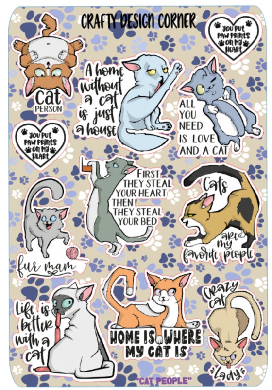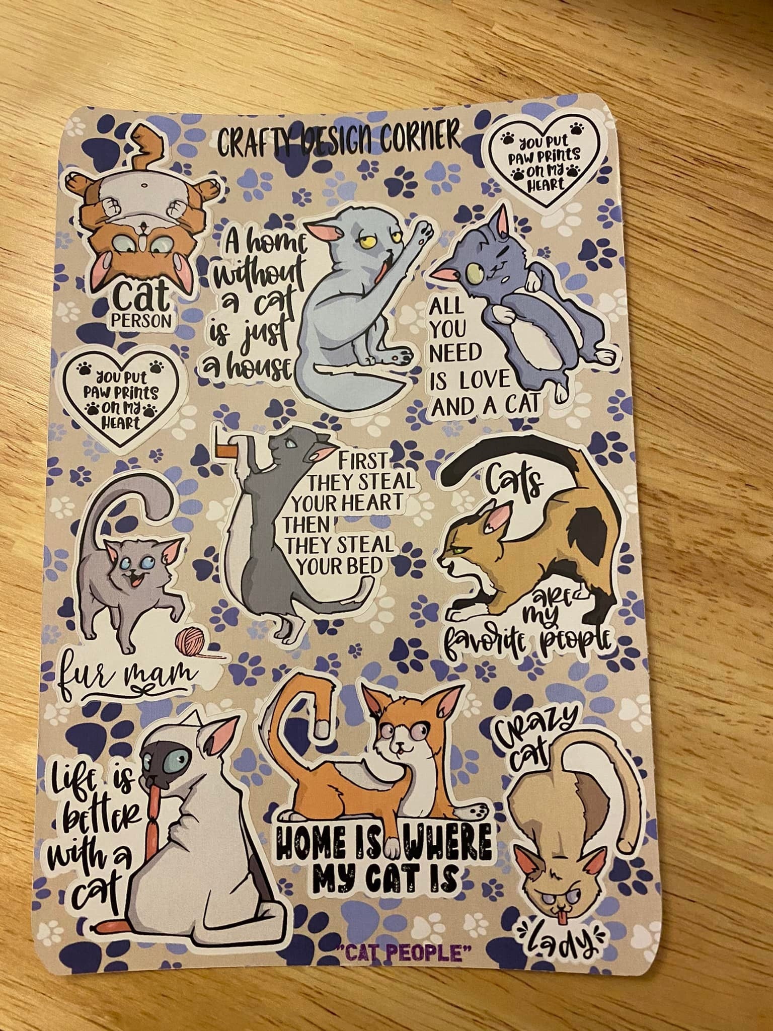 Cat Mom Sticker Sheet, this is printed on very strong White Vinyl type of BOPP Paper and then cut around each sticker leaving a small white outline. Can add to any hard surface, idea for planners.