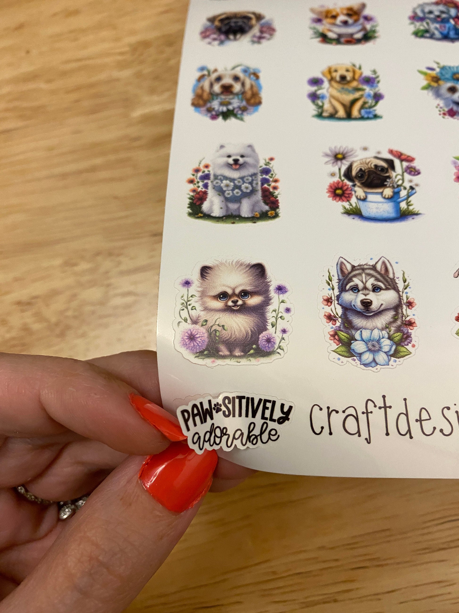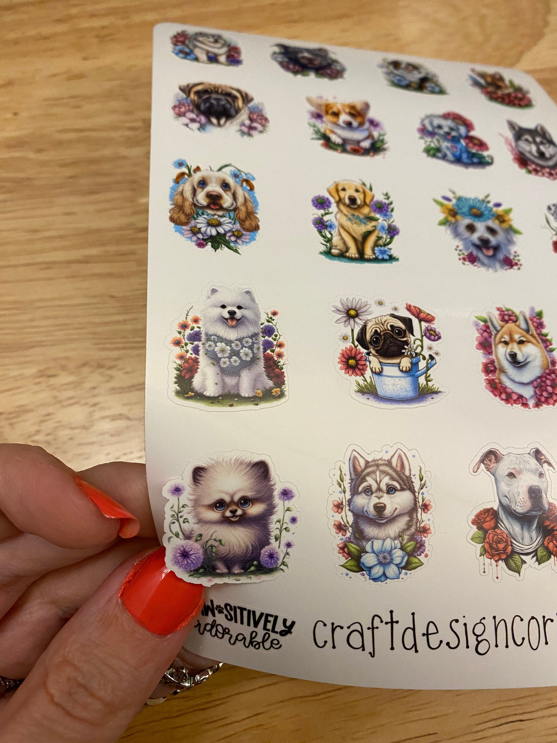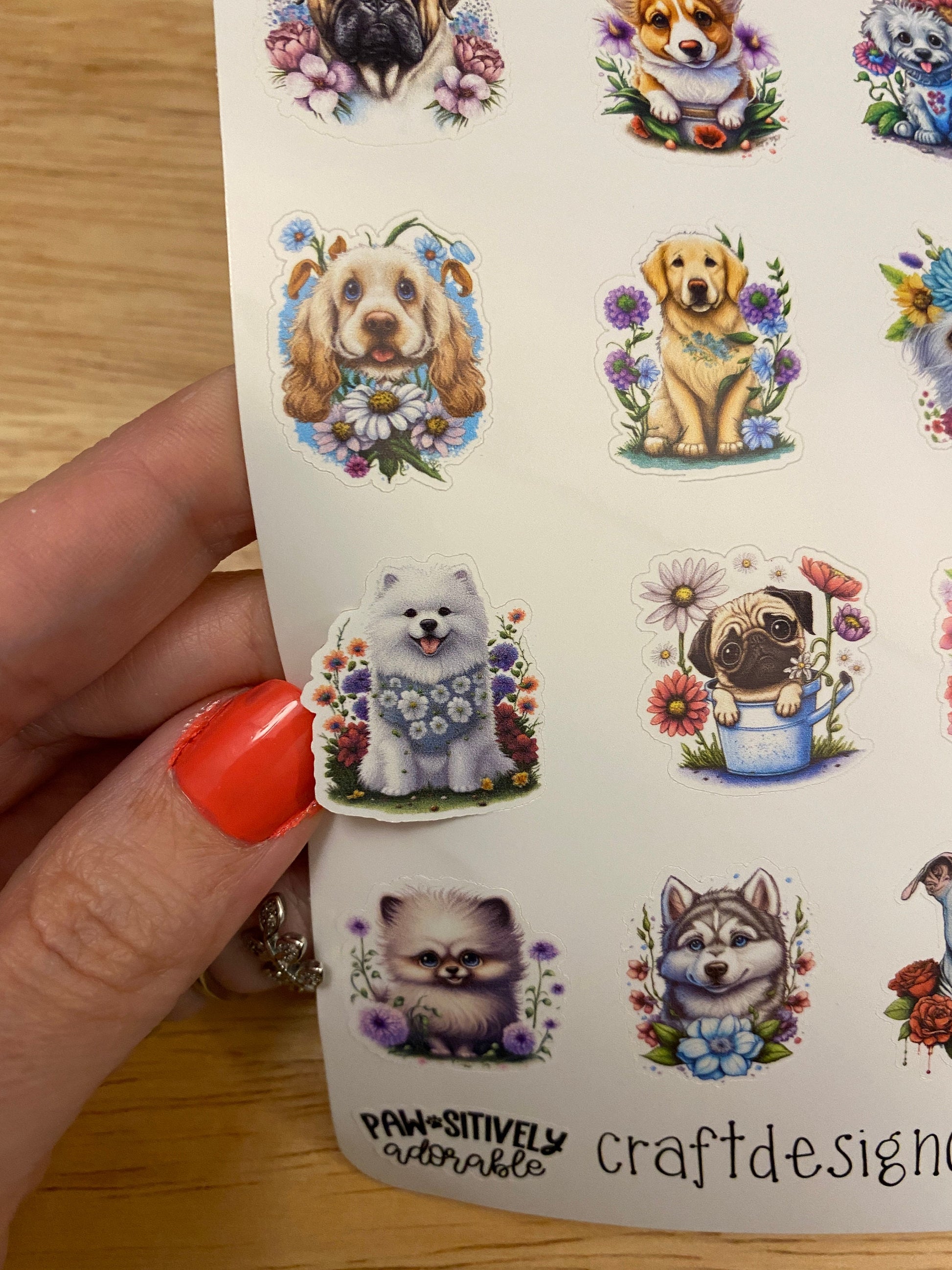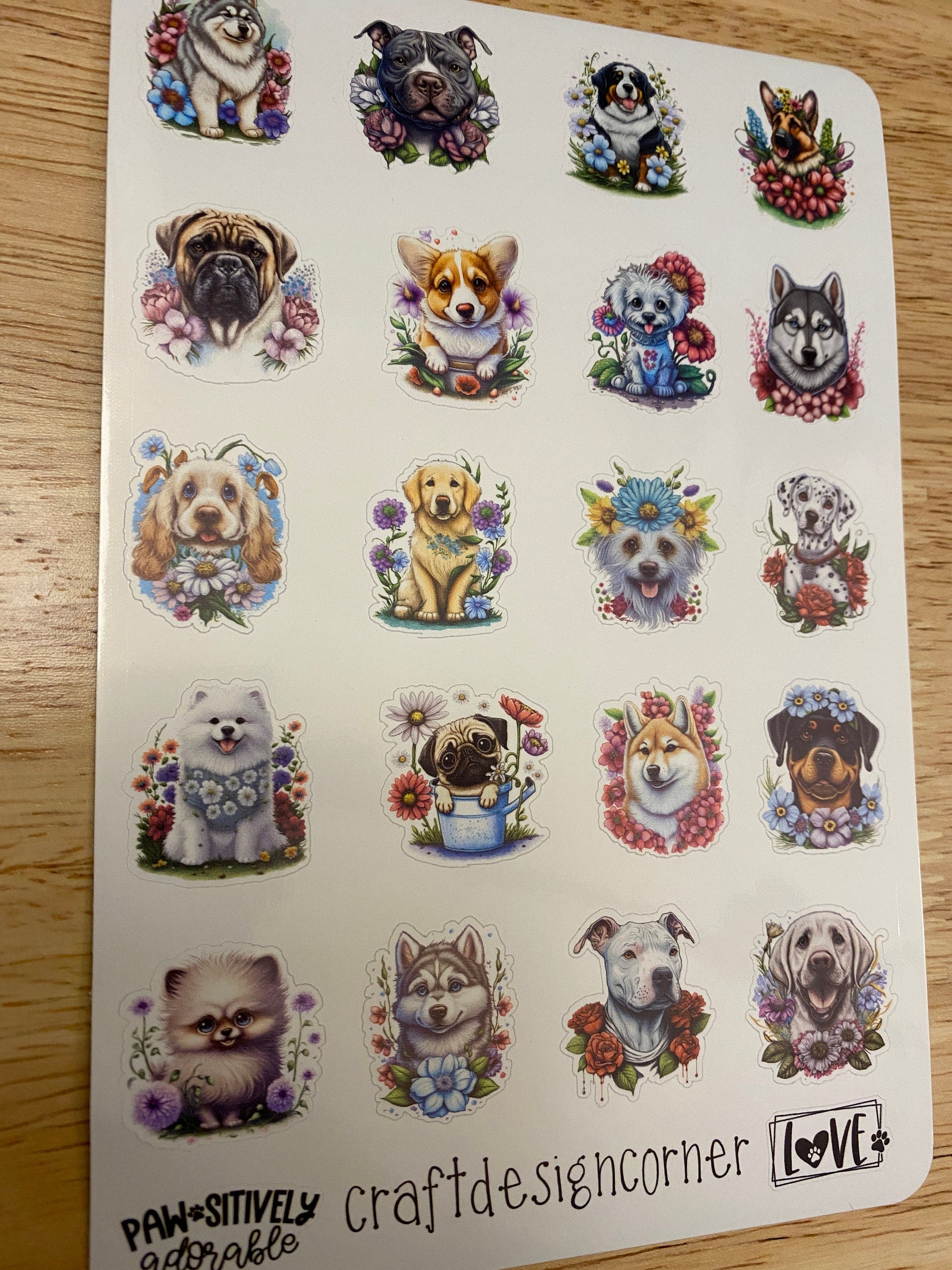 Sheet of Cute Dogs in Flowers Stickers, this is printed on very strong White Vinyl type of BOPP Paper and then cut around each sticker leaving a small white outline. Can add to any hard surface, idea for planners.