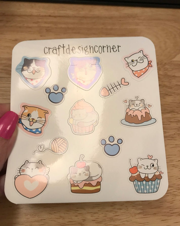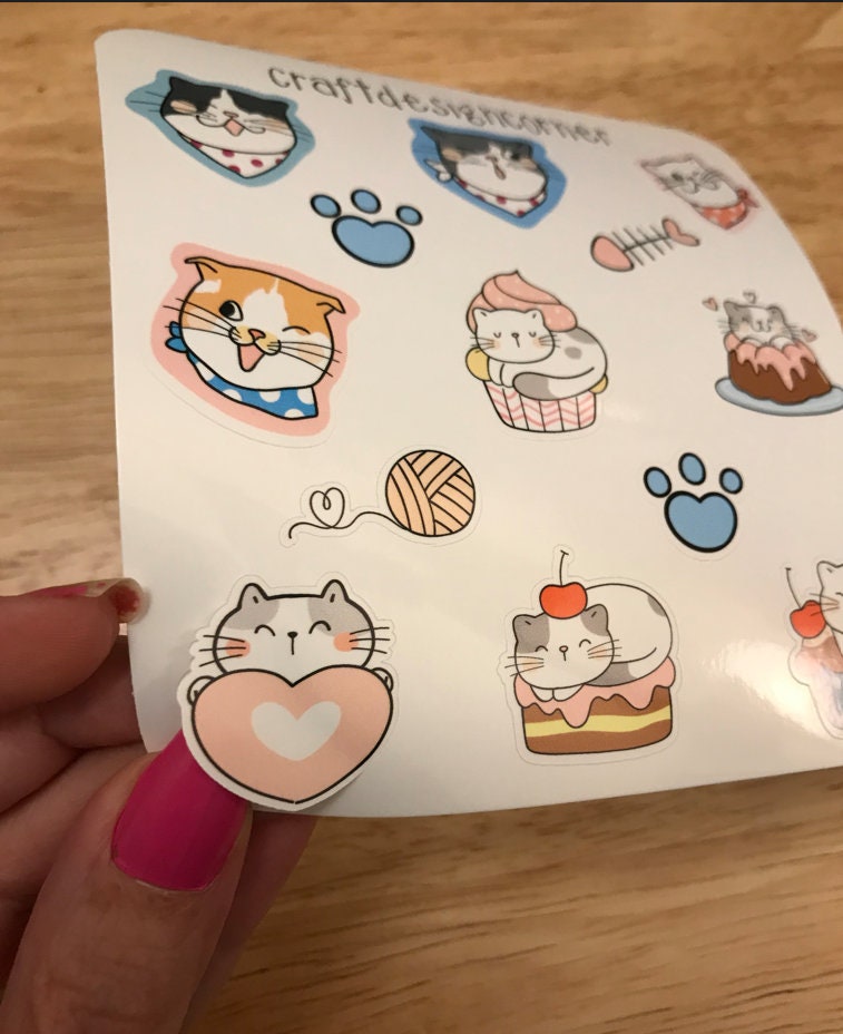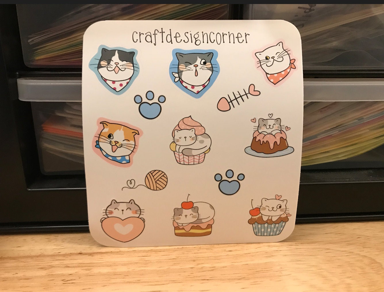 Sheet of Cute Hungry Cat Stickers, this is printed on very strong White Vinyl type of BOPP Paper and then cut around each sticker leaving a small white outline. Can add to any hard surface, idea for planners.