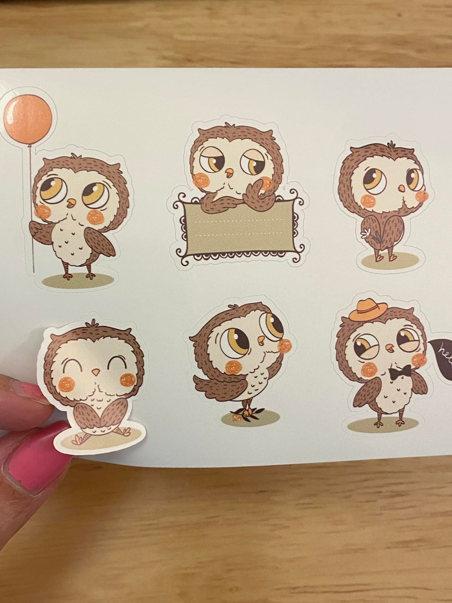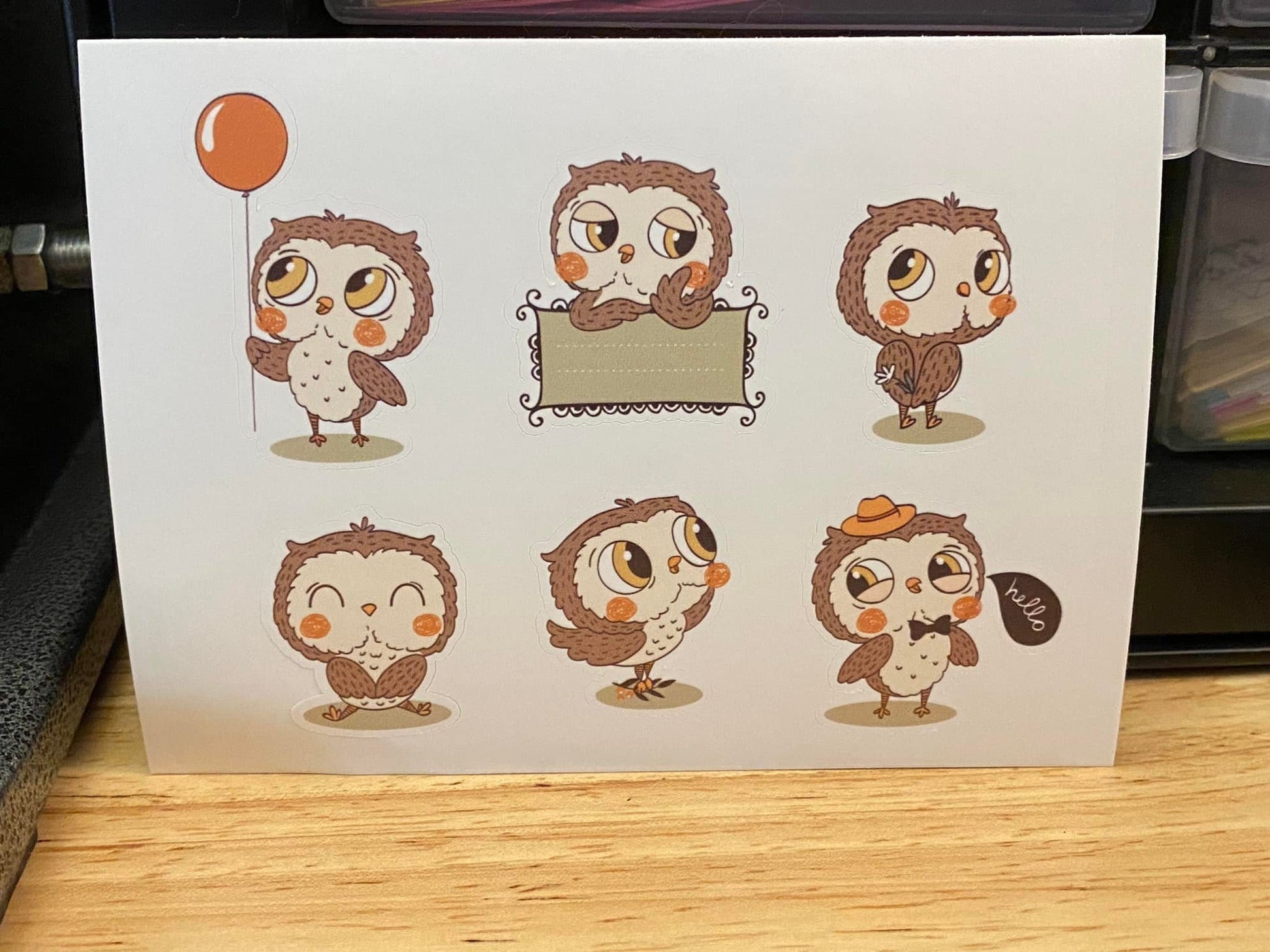 Sheet of Cute Owl Stickers, this is printed on very strong White Vinyl type of BOPP Paper and then cut around each sticker leaving a small white outline. Can add to any hard surface, idea for planners.