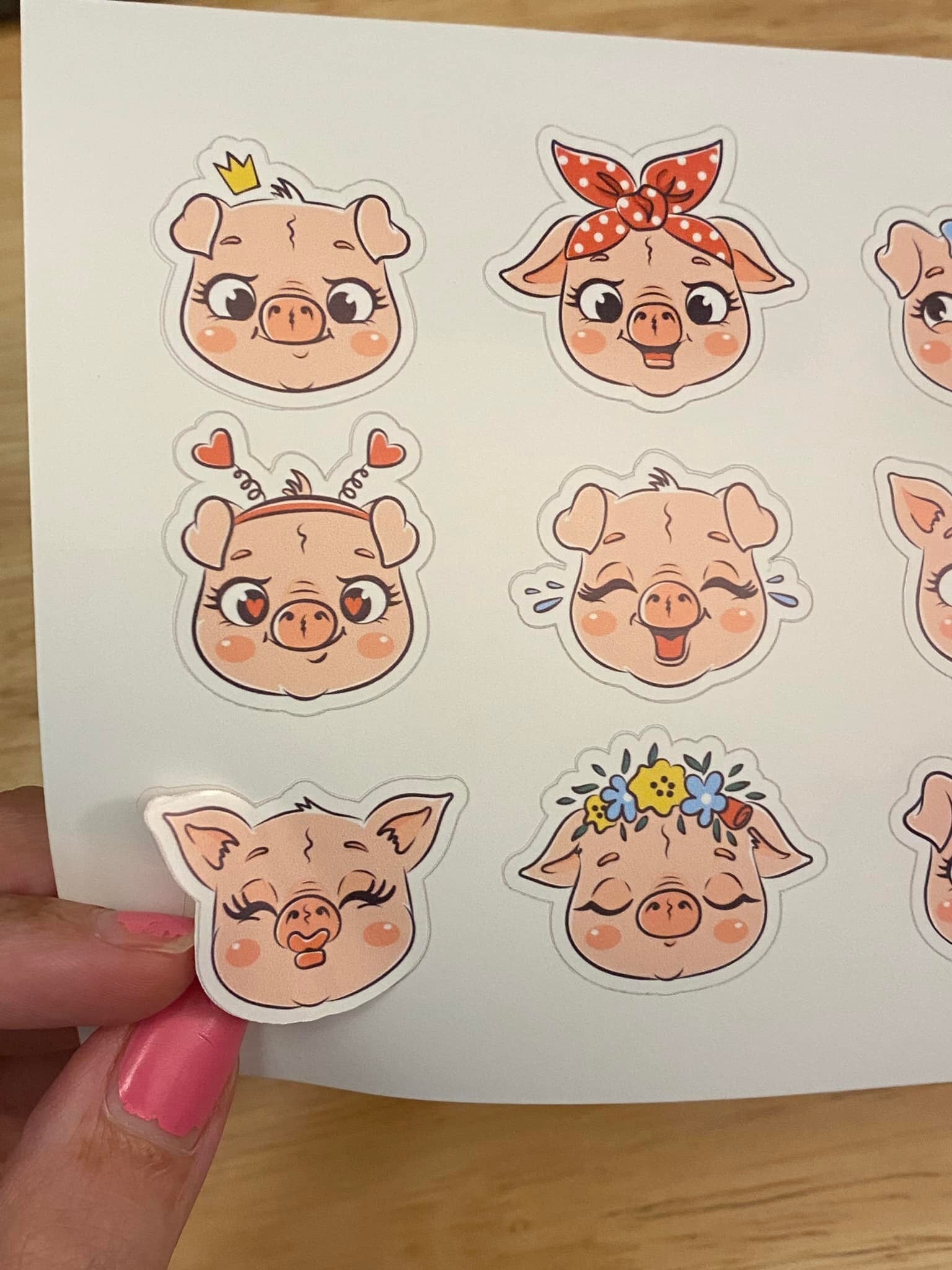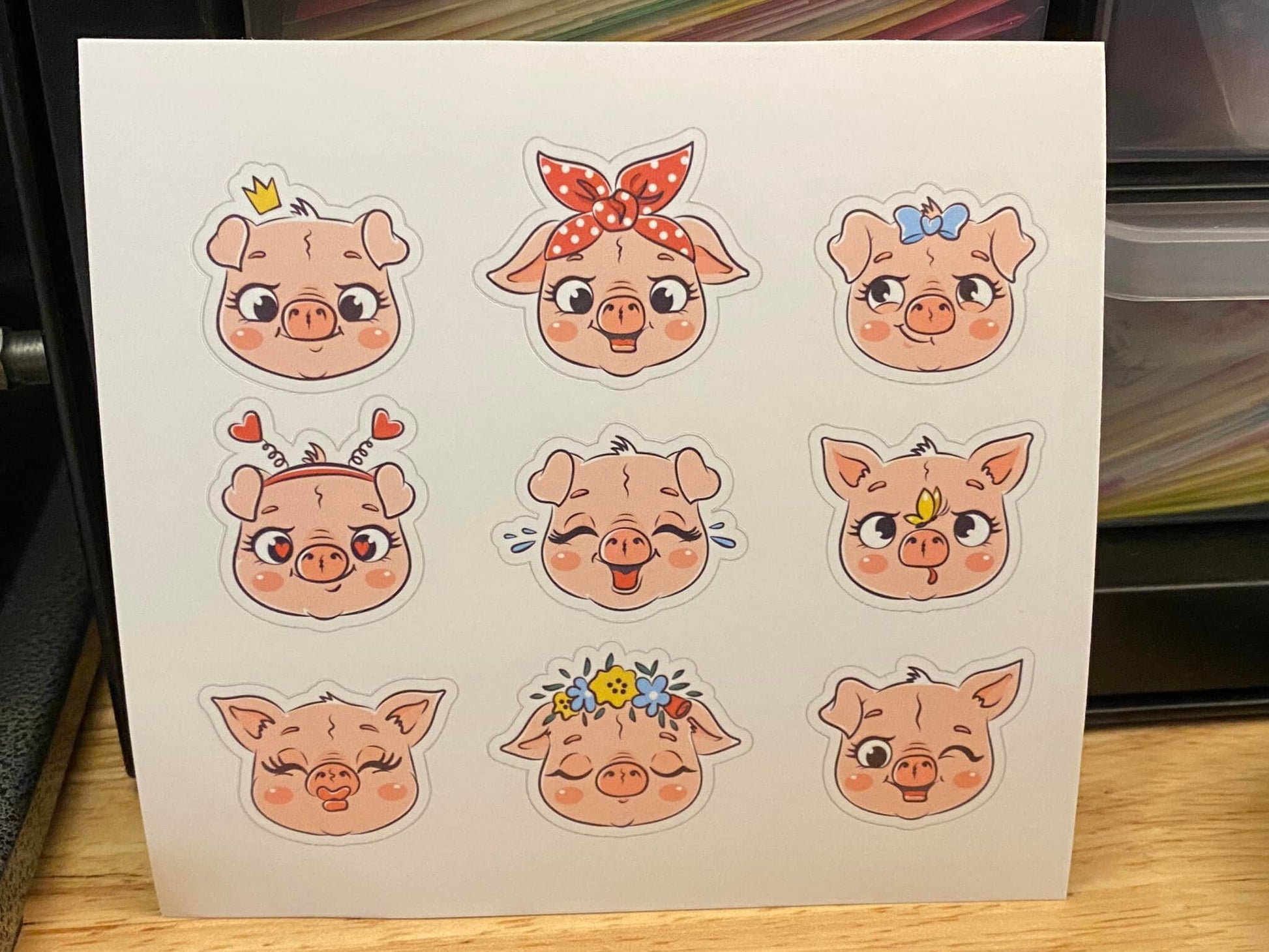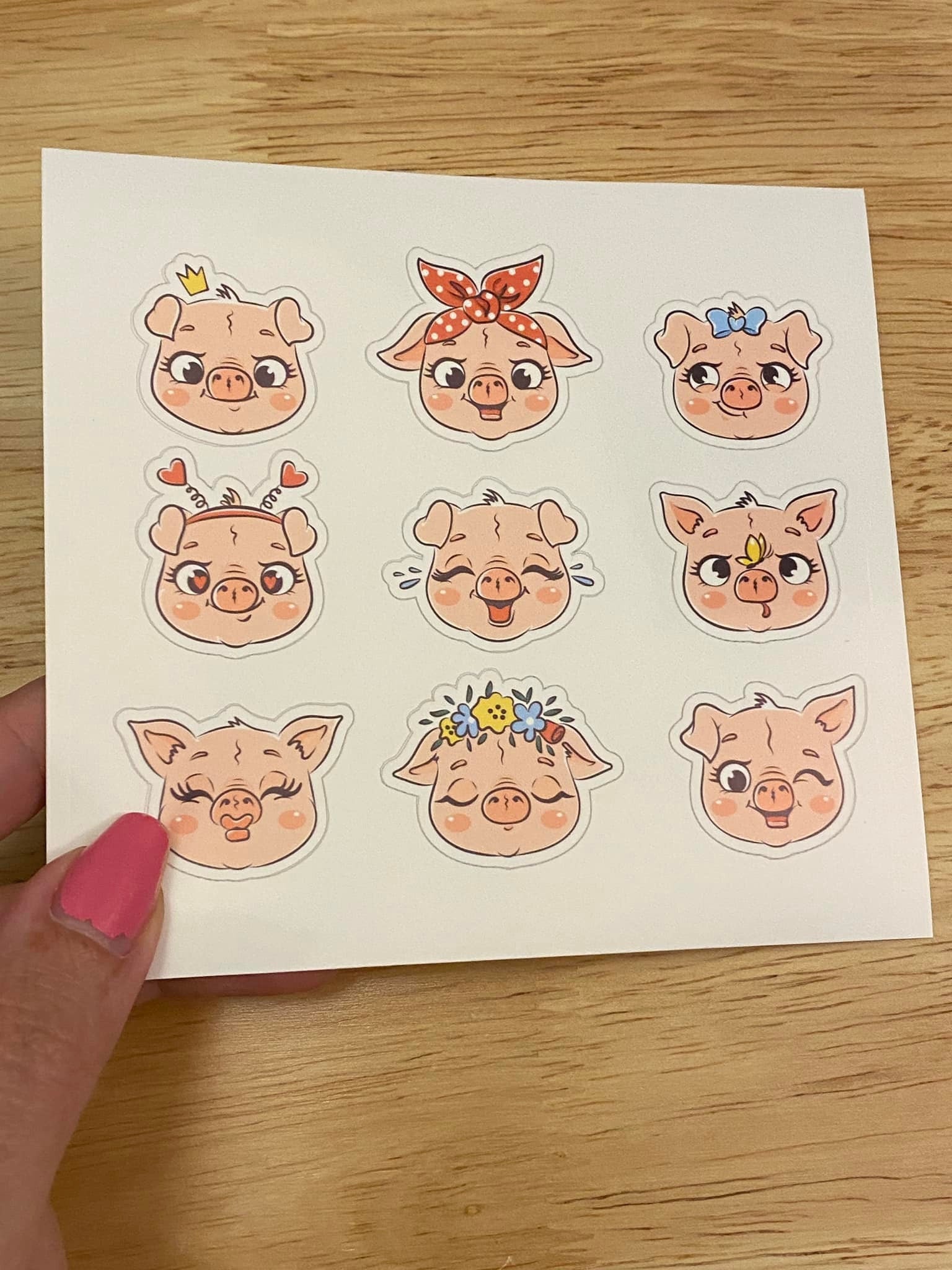 Sheet of Cute Pig Face Stickers, this is printed on very strong White Vinyl type of BOPP Paper and then cut around each sticker leaving a small white outline. Can add to any hard surface, idea for planners.