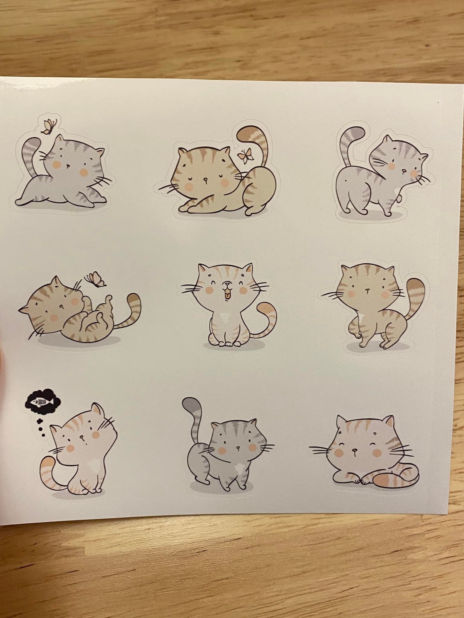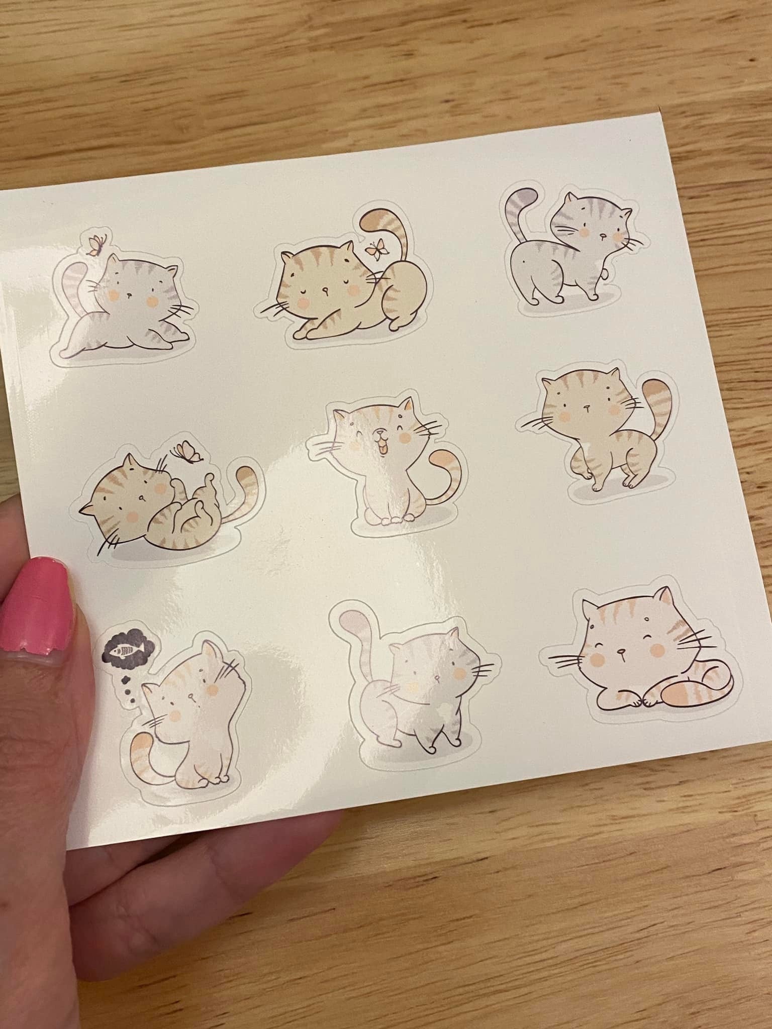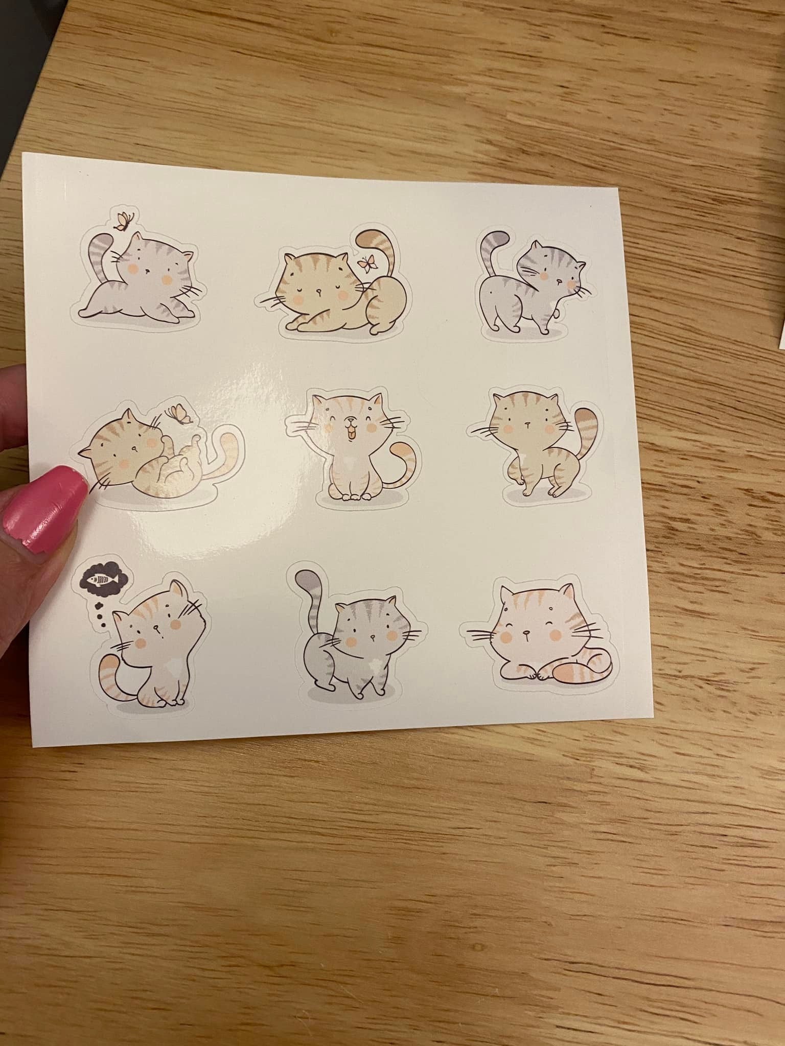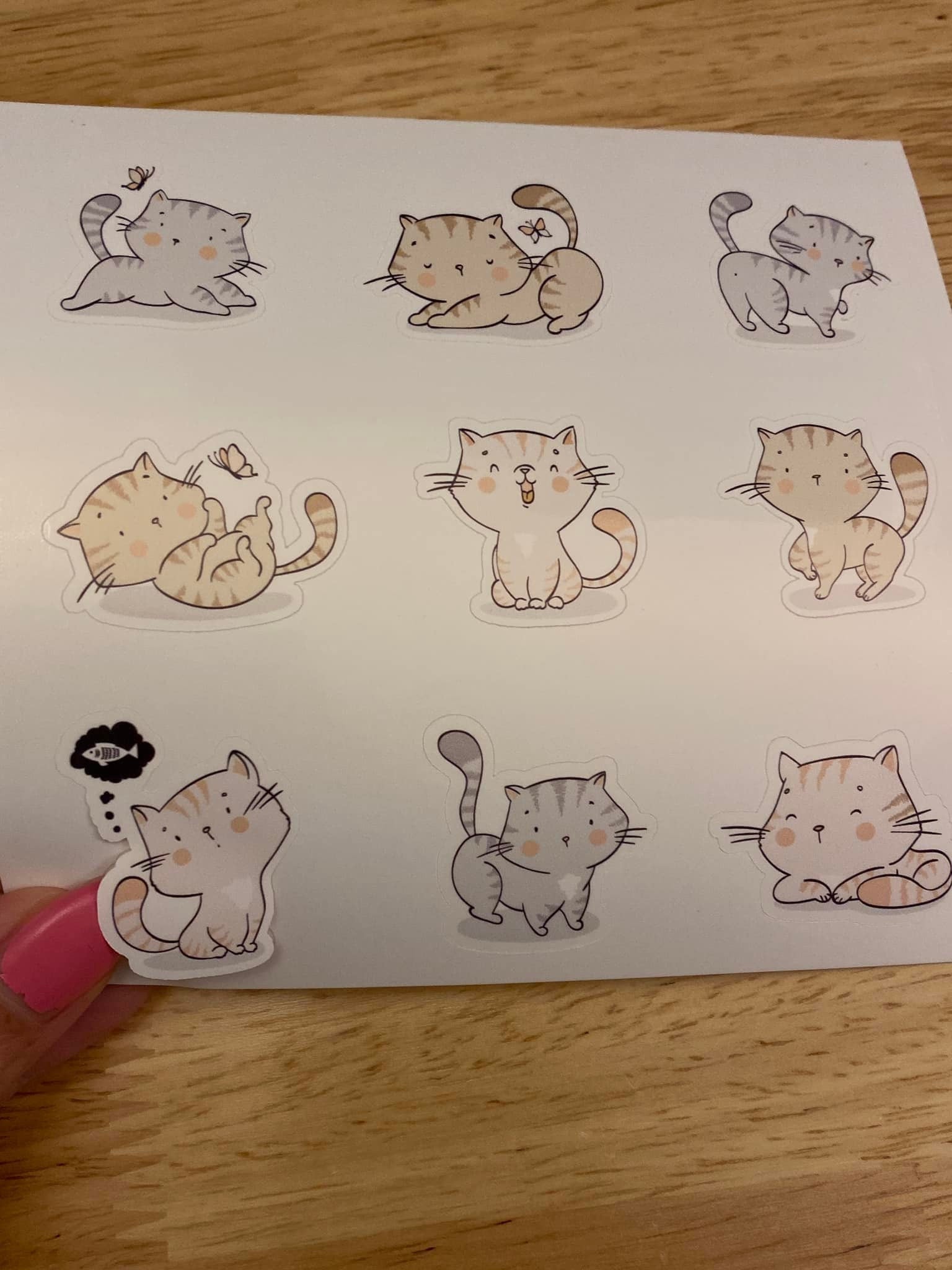 Sheet of Cute Playing Cat, this is printed on very strong White Vinyl type of BOPP Paper and then cut around each sticker leaving a small white outline. Can add to any hard surface, idea for planners.