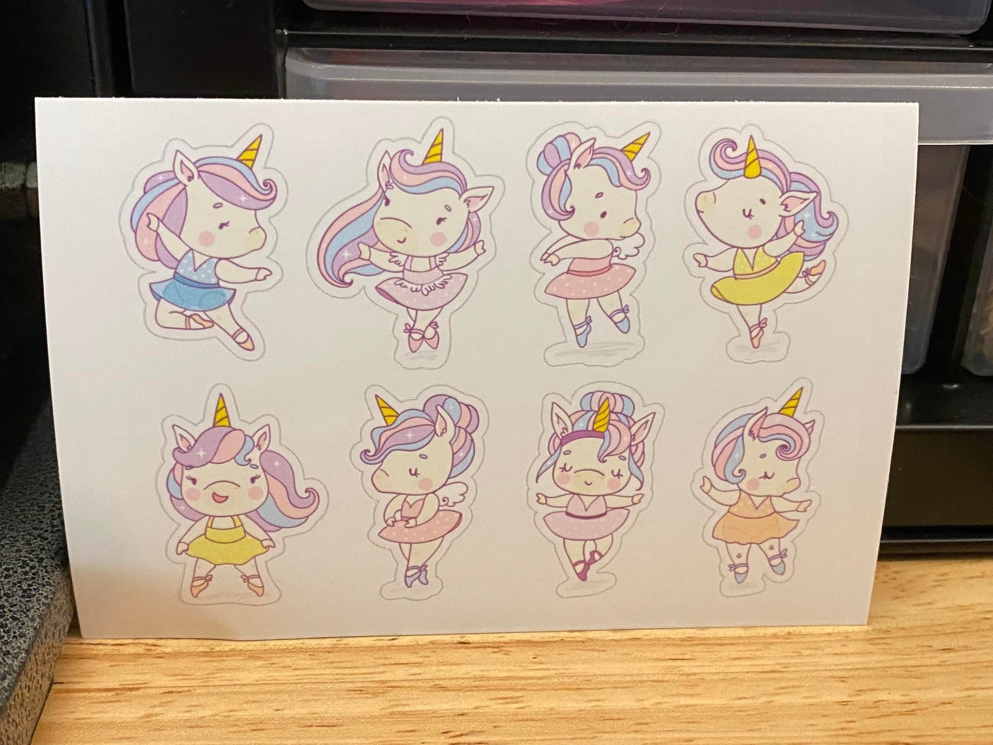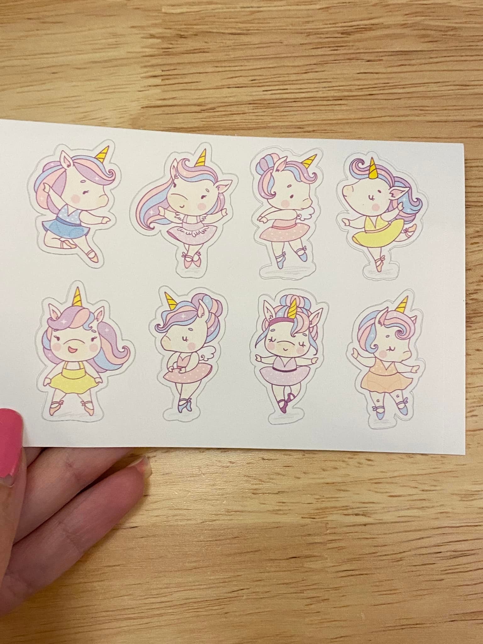 Sheet of Cute Unicorn Stickers, this is printed on very strong White Vinyl type of BOPP Paper and then cut around each sticker leaving a small white outline. Can add to any hard surface, idea for planners.