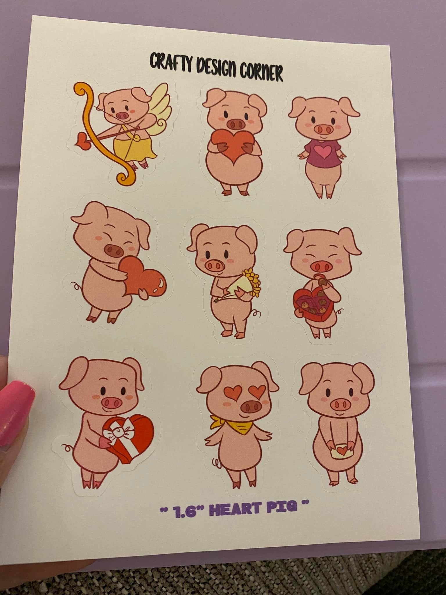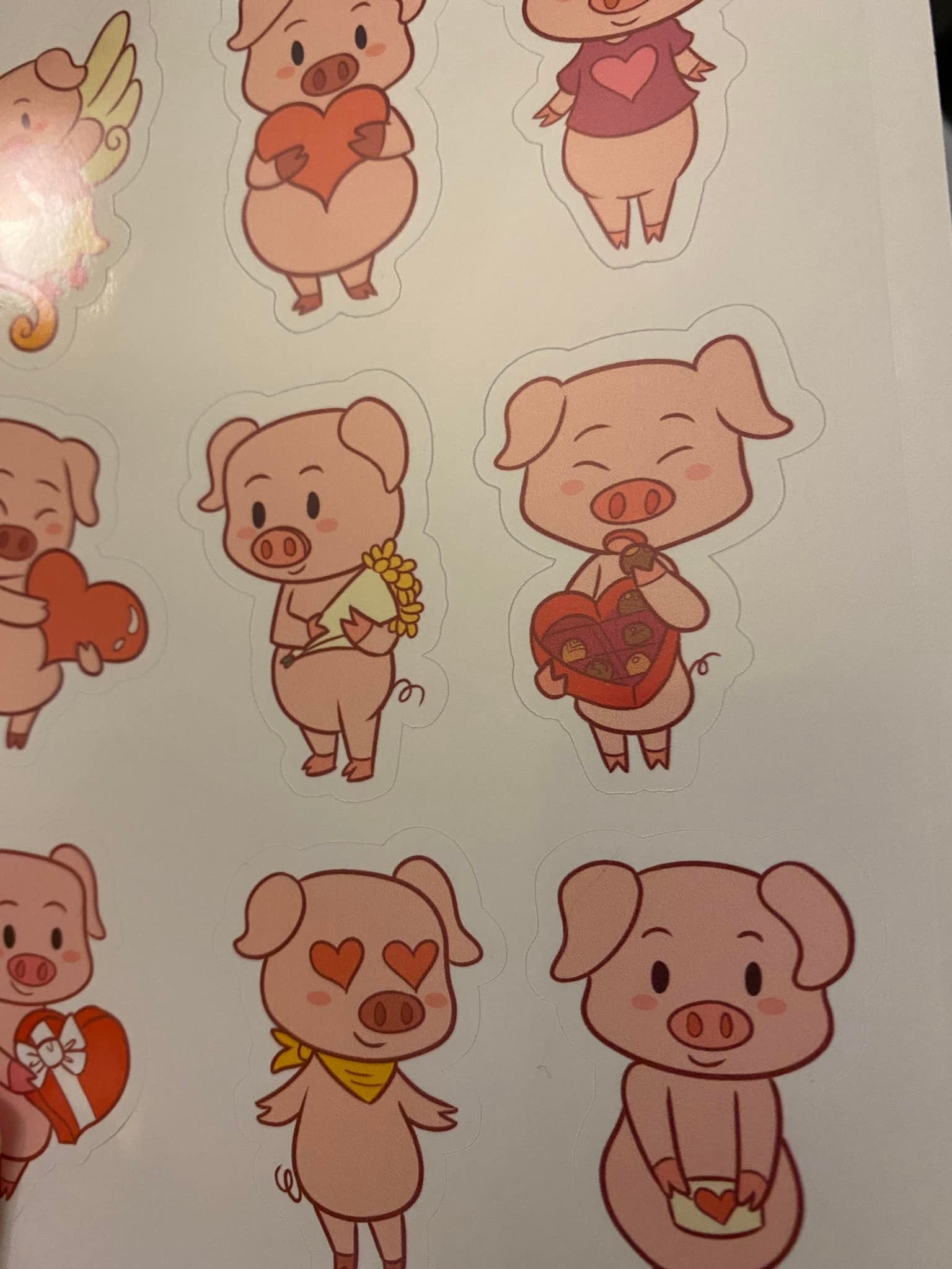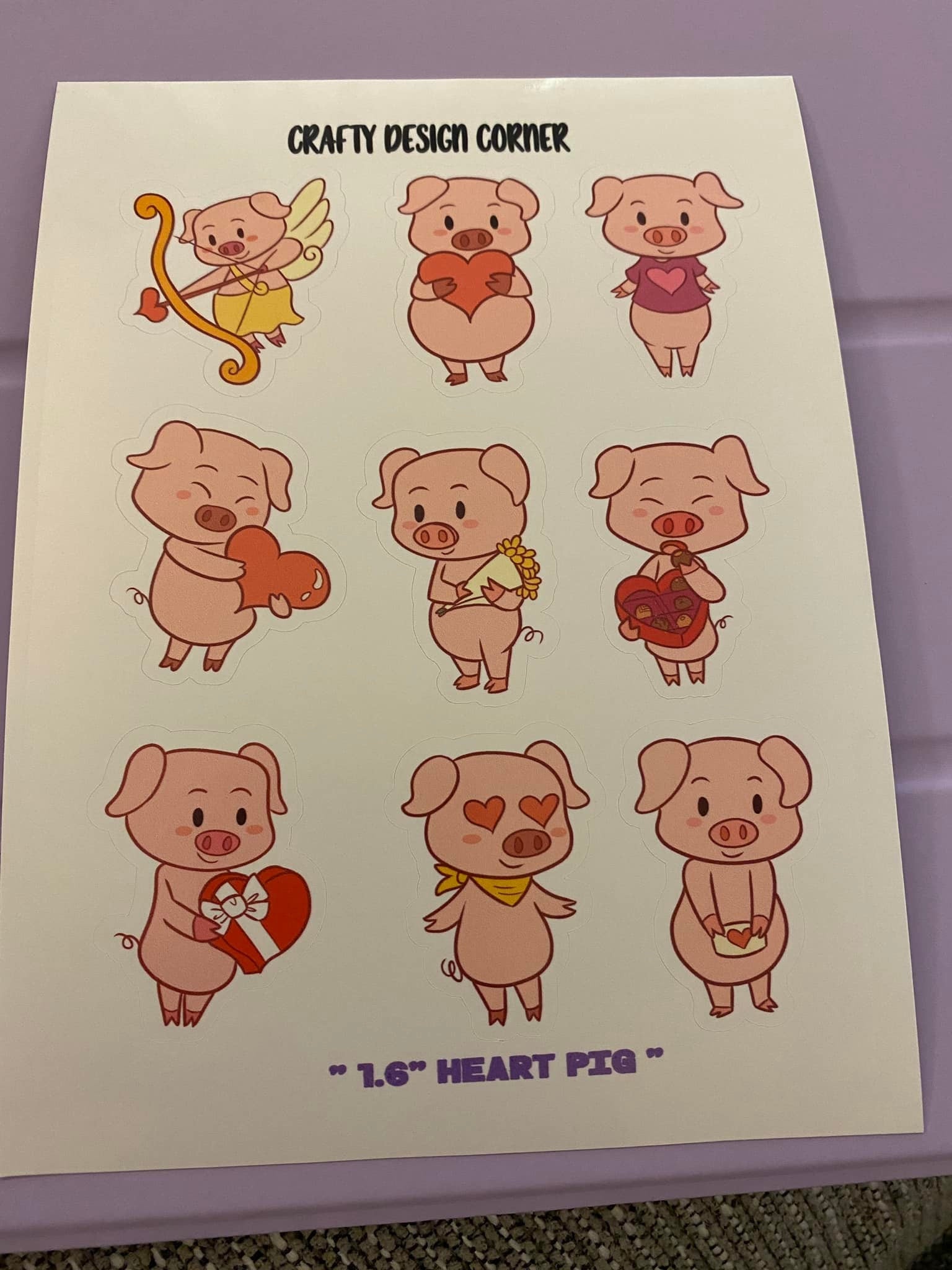 Sheet of Pigs with Heart Stickers, this is printed on very strong White Vinyl type of BOPP Paper and then cut around each sticker leaving a small white outline. Can add to any hard surface, idea for planners.