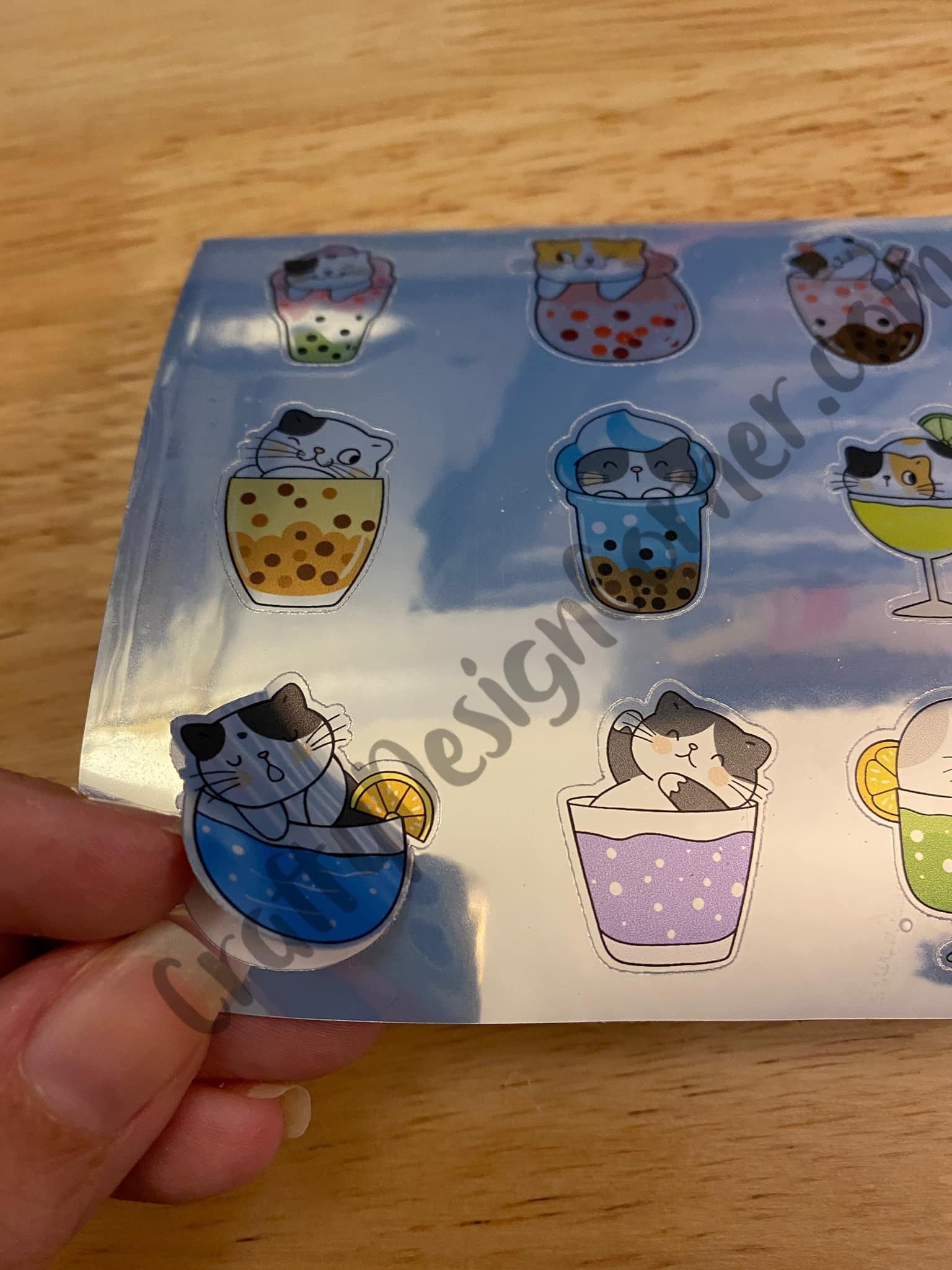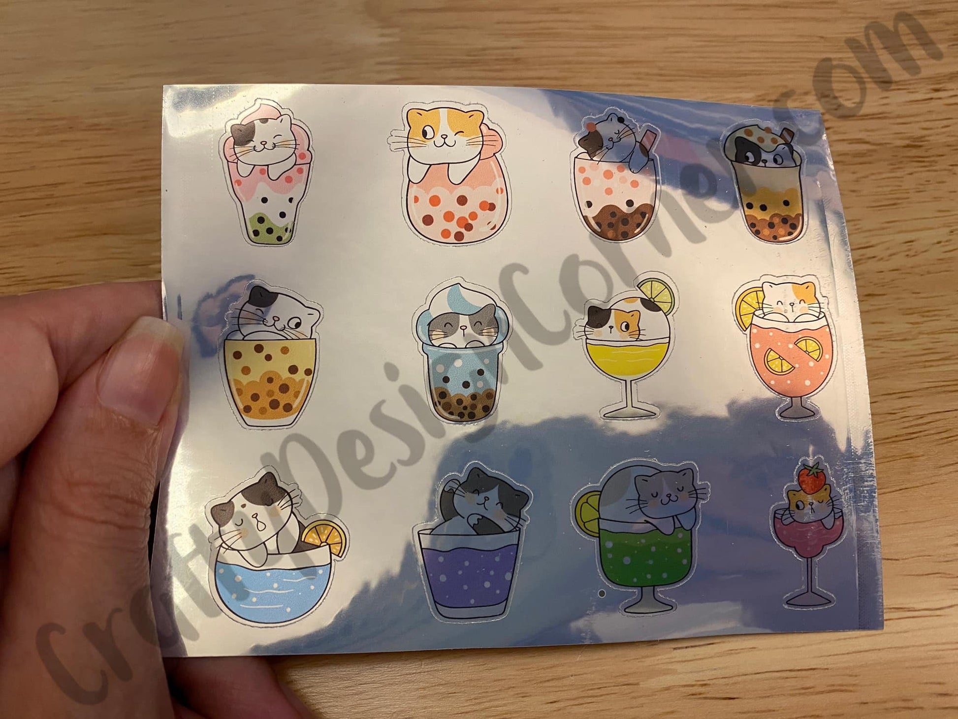 Silver Holographic Cat Boba Tea Stickers Sheet, this is printed on very strong Silver Vinyl type of BOPP Paper and then cut around each sticker leaving a small outline, as seen in photos. Can add to any hard surface, idea for planners.