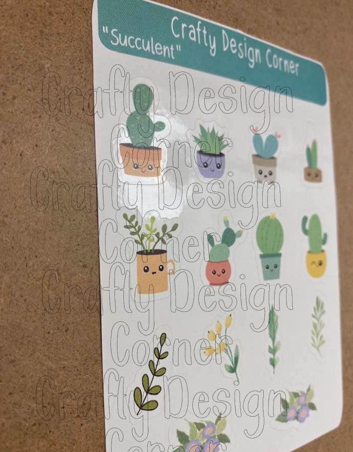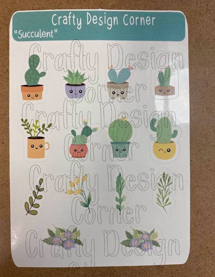 Succulent Planner STICKER SHEET, this is printed on very strong White Vinyl type of BOPP Paper and then cut around each sticker leaving a small white outline. Can add to any hard surface, idea for planners.