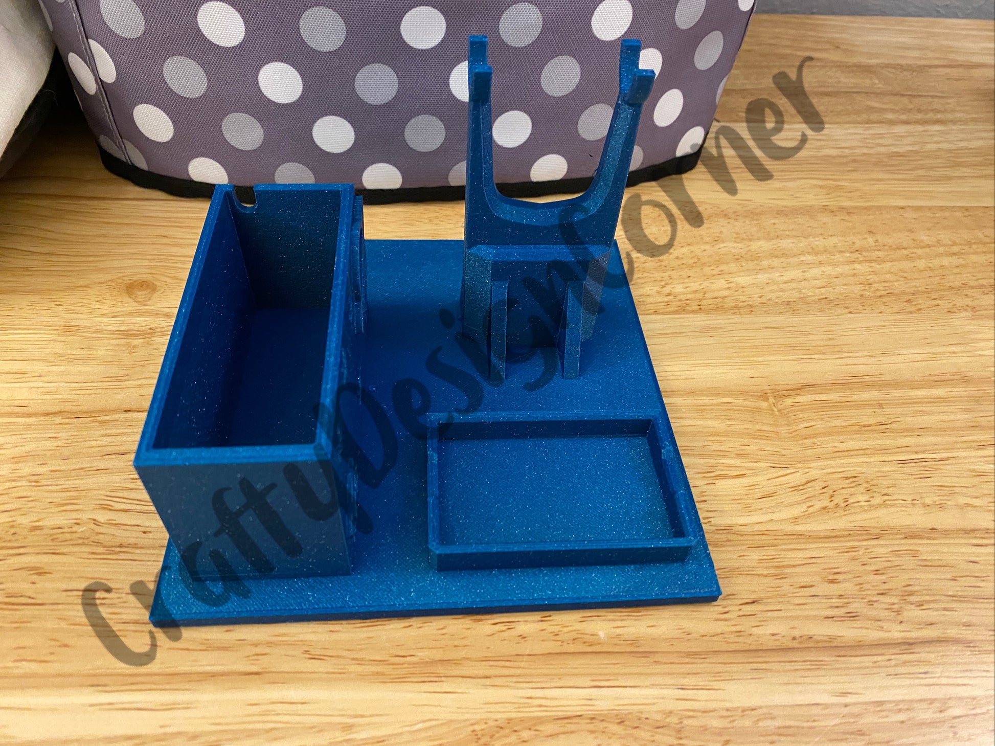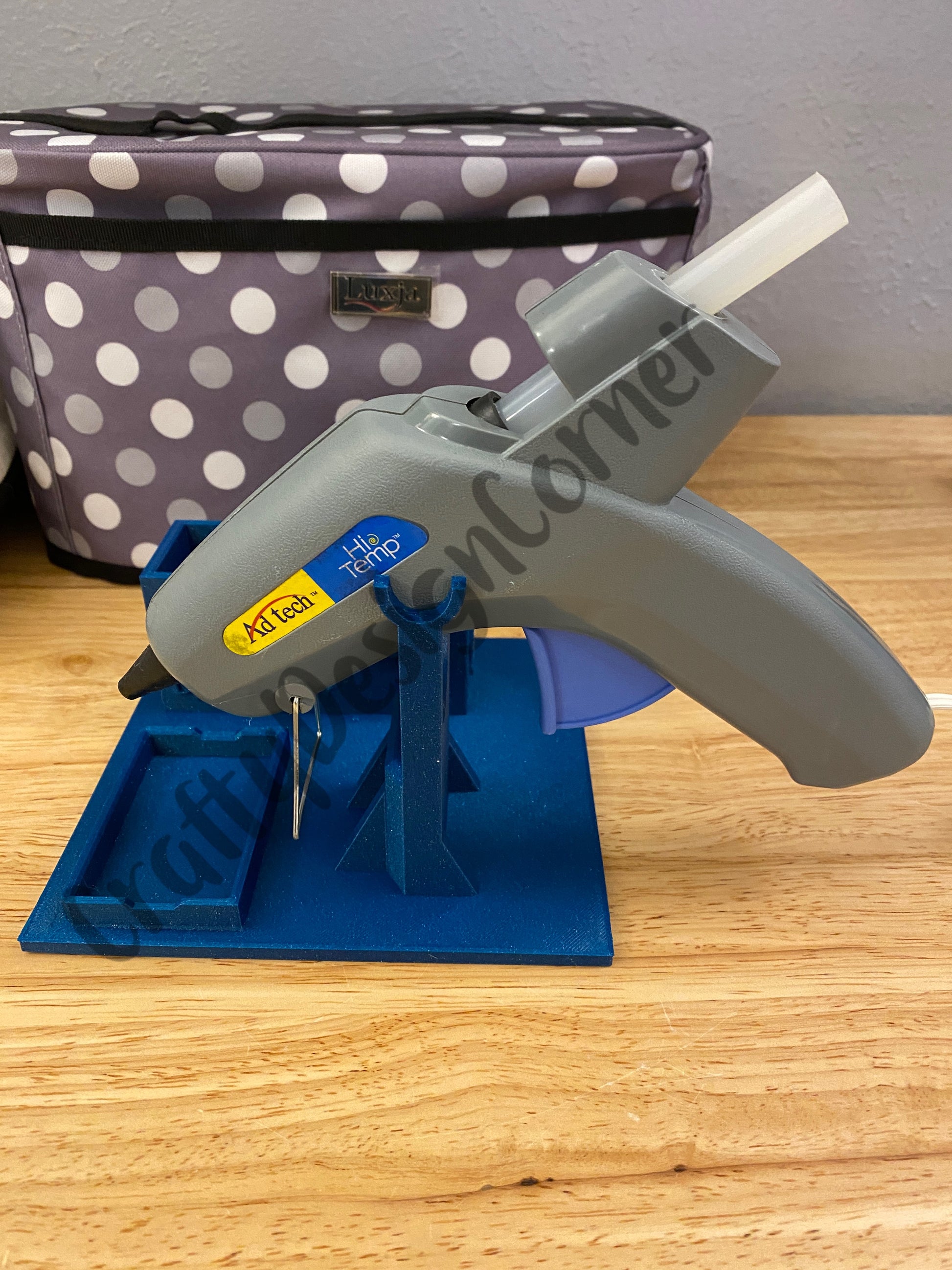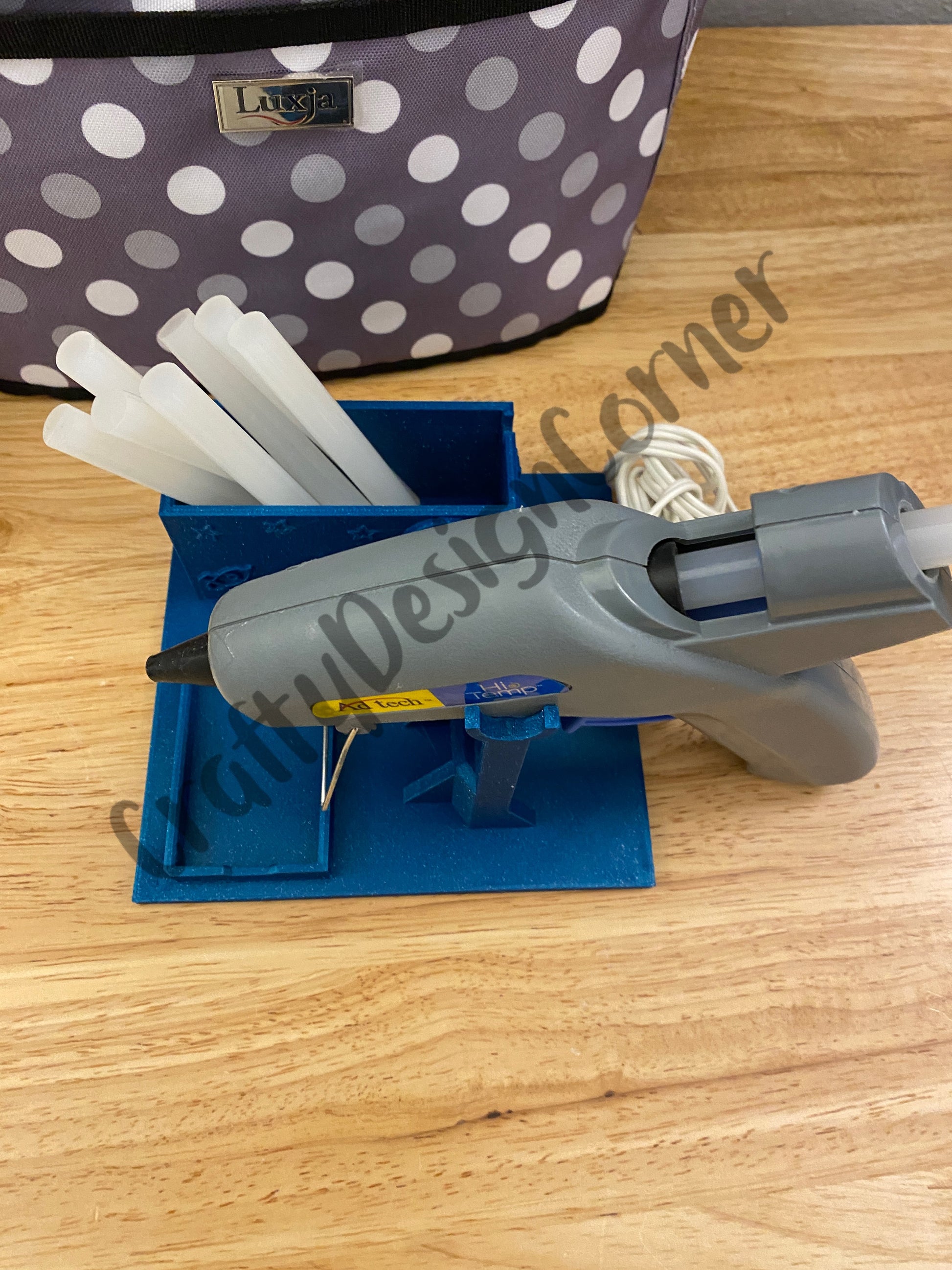 Hot Glue Gun Holder this is a 3D Printed Caddy Stand Holder. This will hold some hot glue sticks as shown or its cord, and allows the hot glue gun to sit on it, this is meant for a hot glue gun.