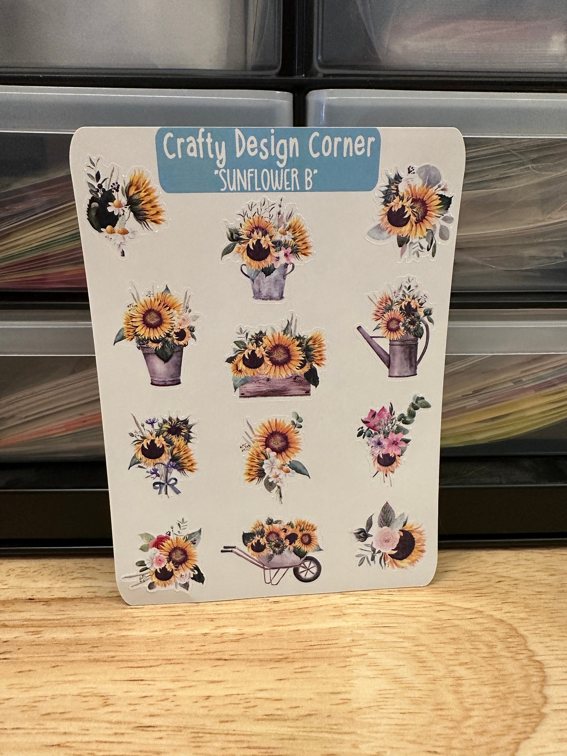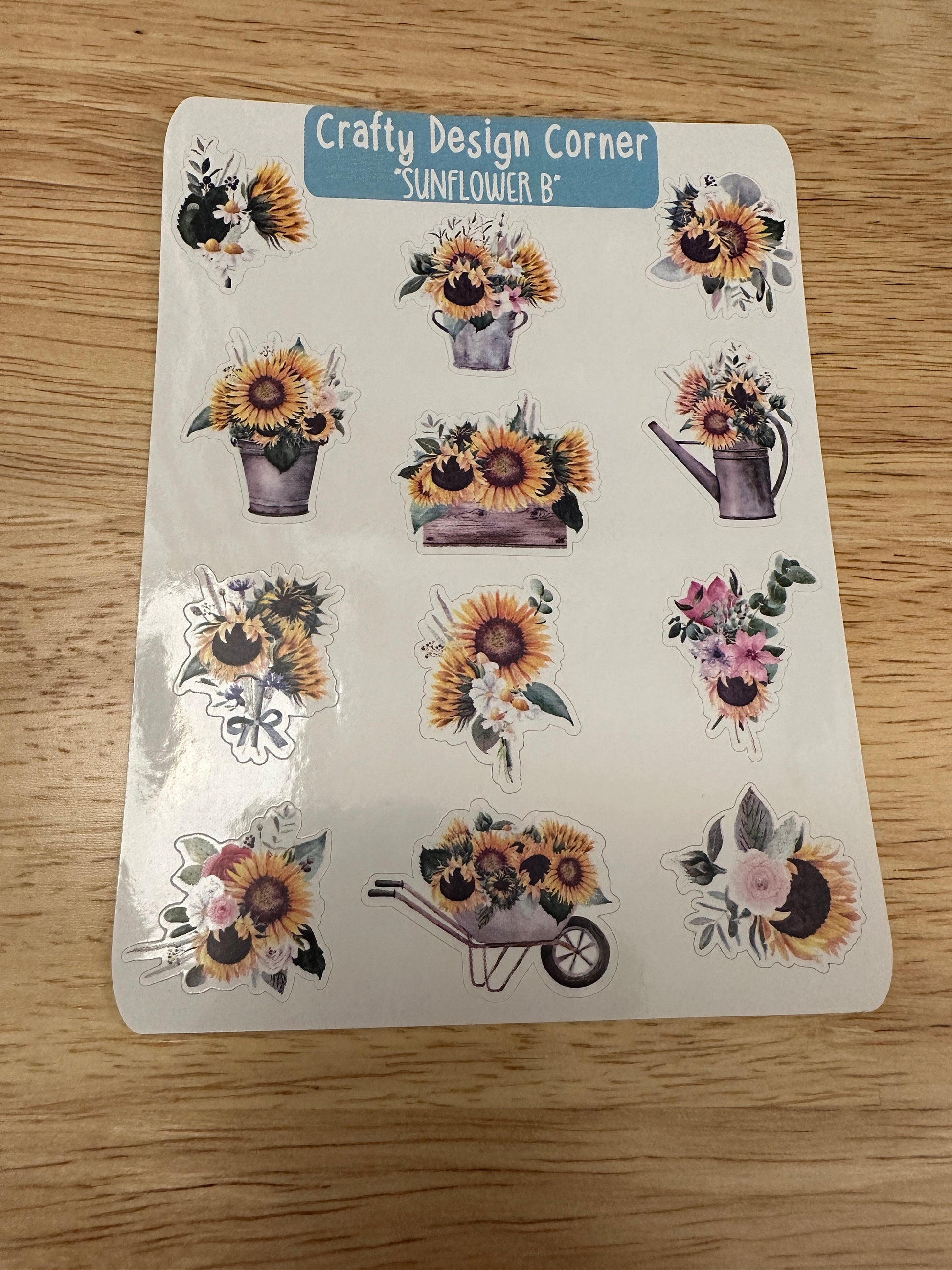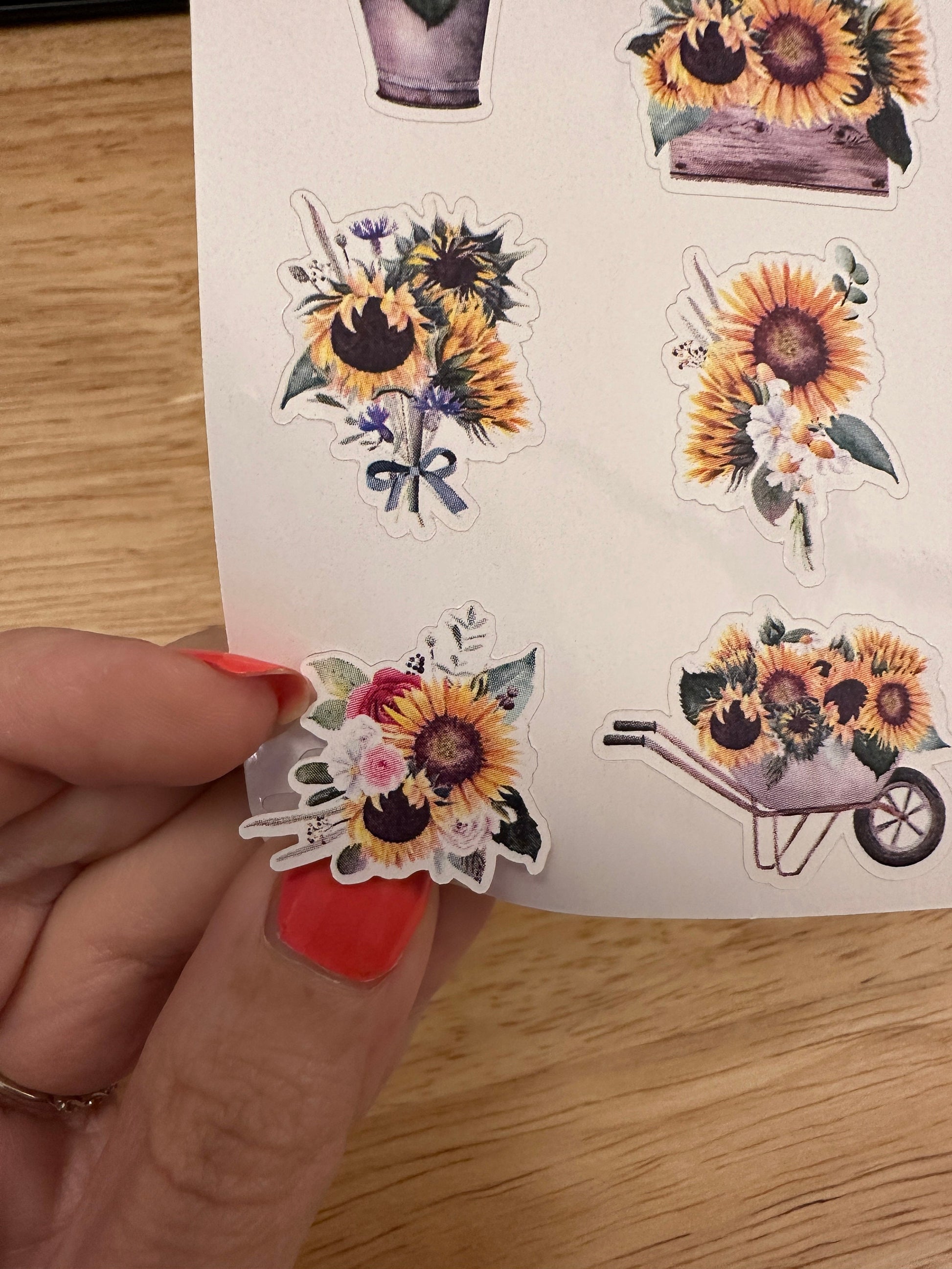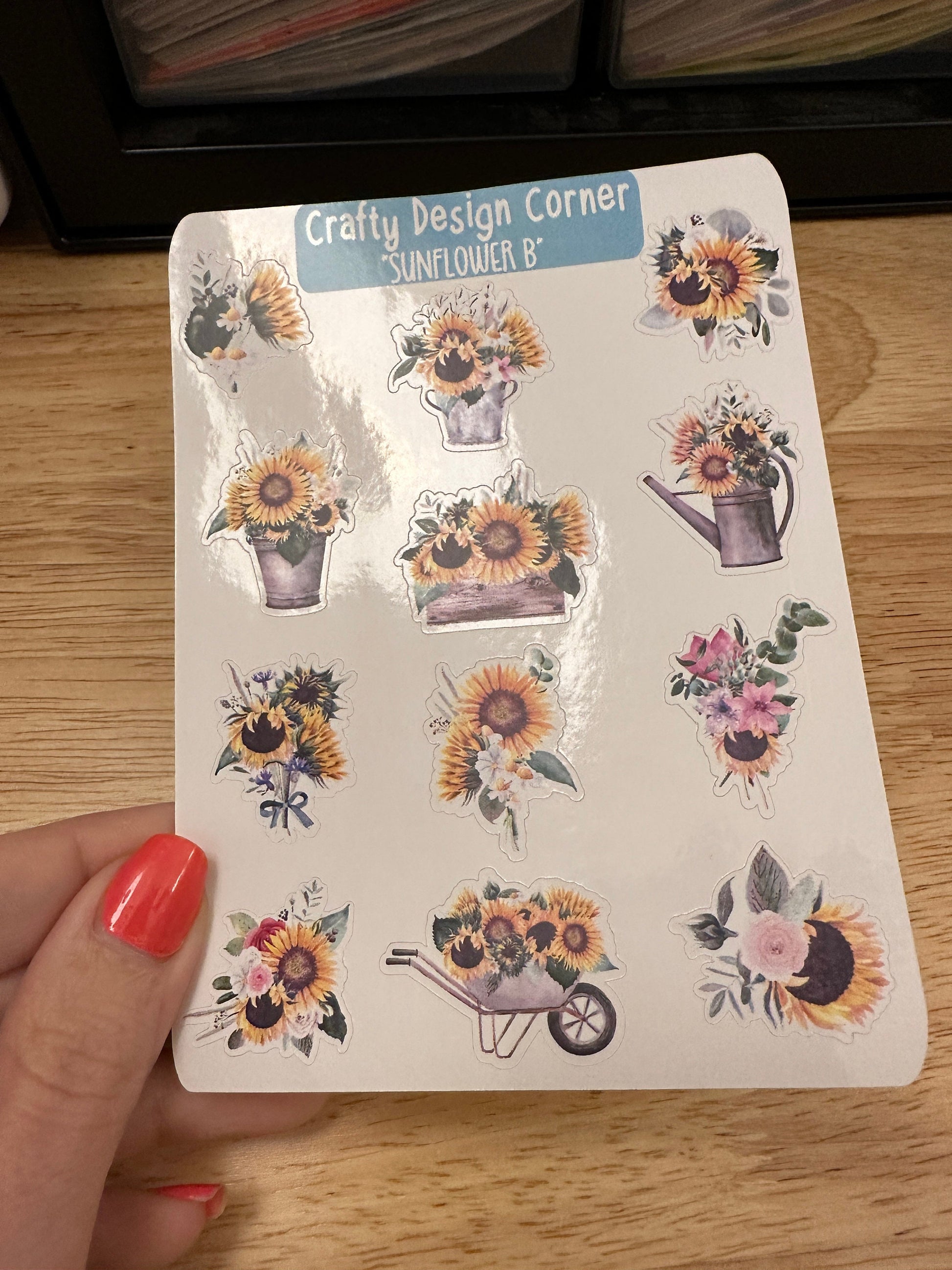 Vased Sunflower Planner STICKER SHEET, this is printed on White sticker Paper and then cut around each sticker leaving a small white outline. Can add to any hard surface, idea for planners.